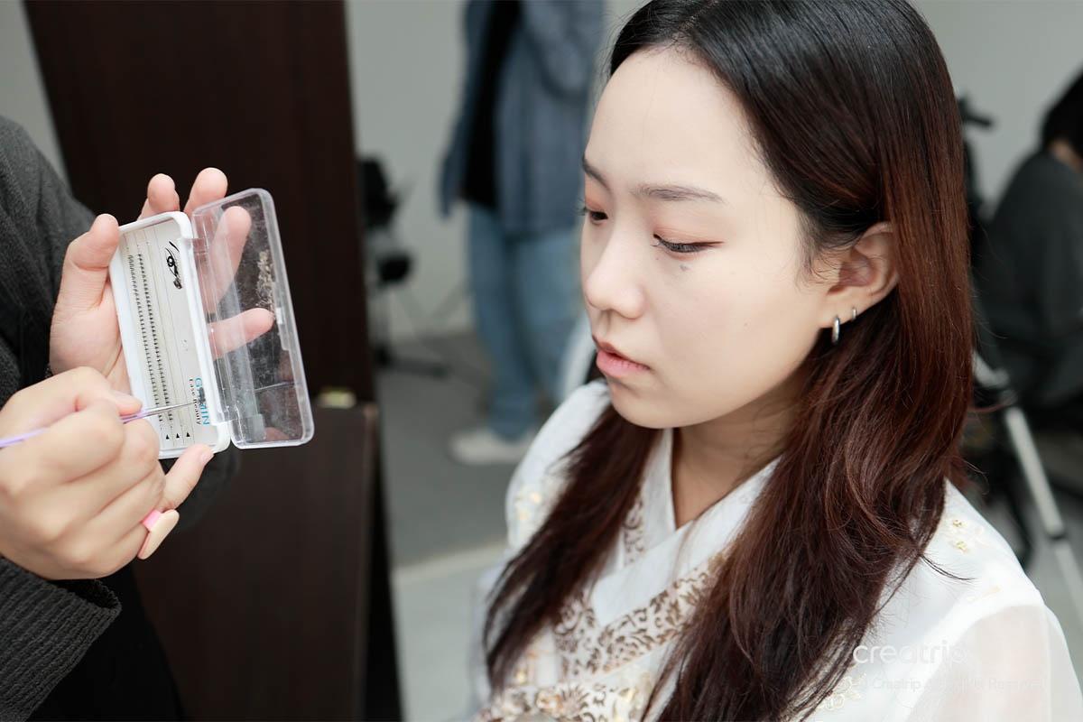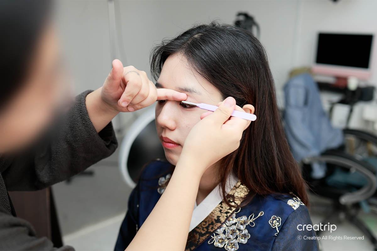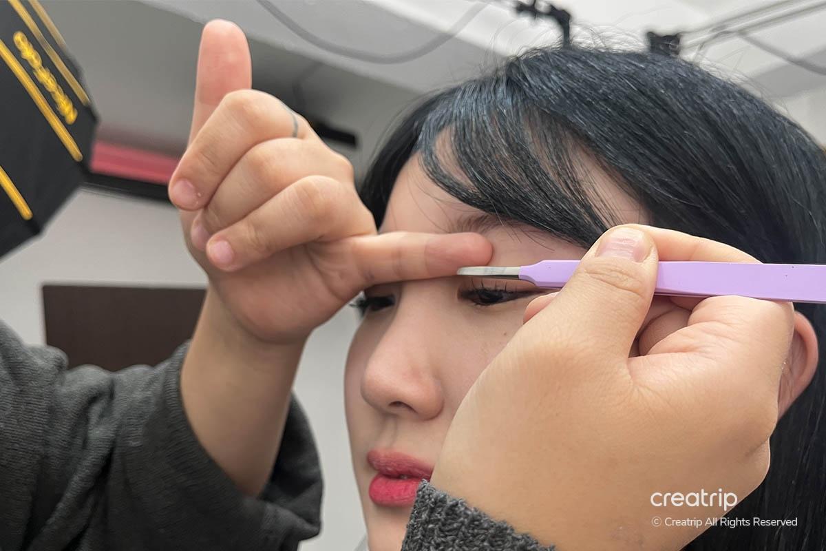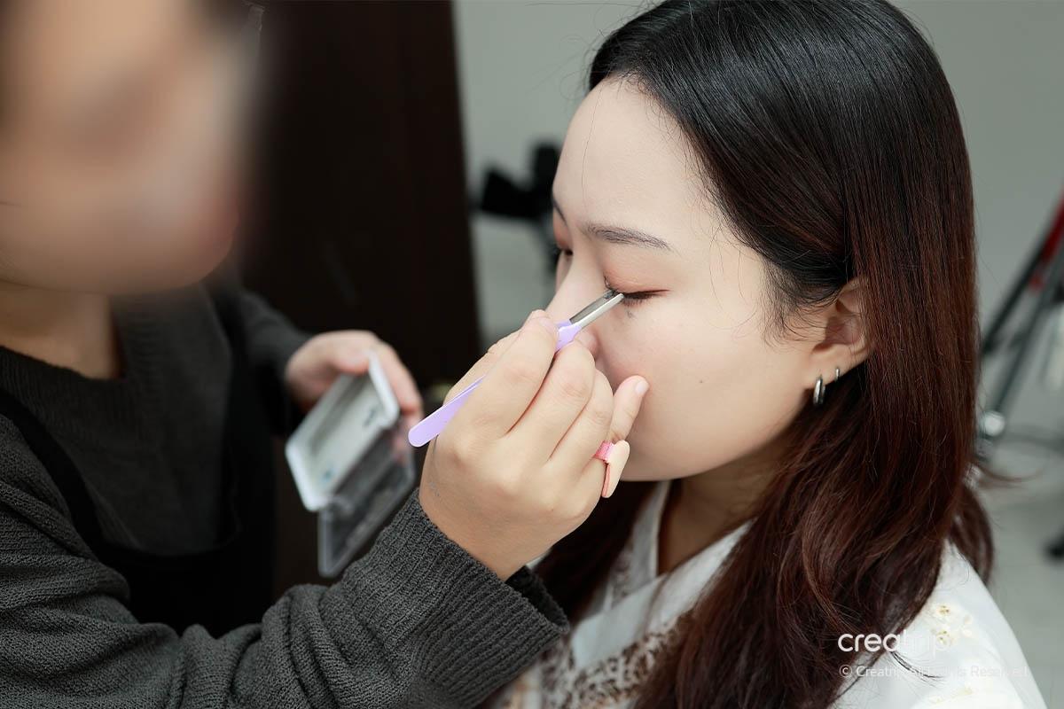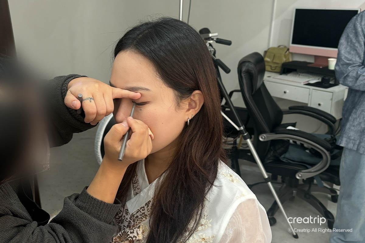 With the base complete, we moved on to eye makeup. The artist applied shadow to add depth to my eyelids, then carefully placed false eyelashes for a finishing touch.
