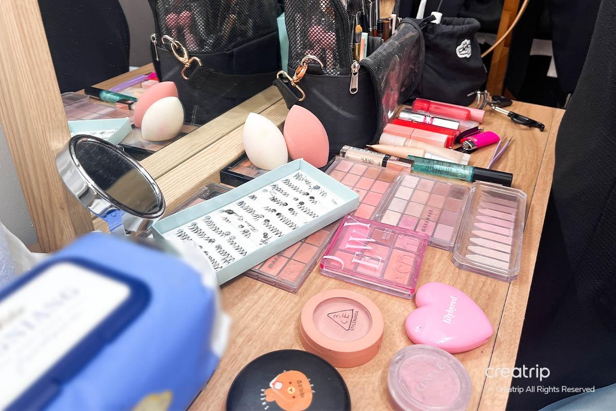 The makeup artist arrived with a range of cosmetics, featuring a variety of eye-catching colors. Today, three of us editors will each take turns getting K-style makeup.