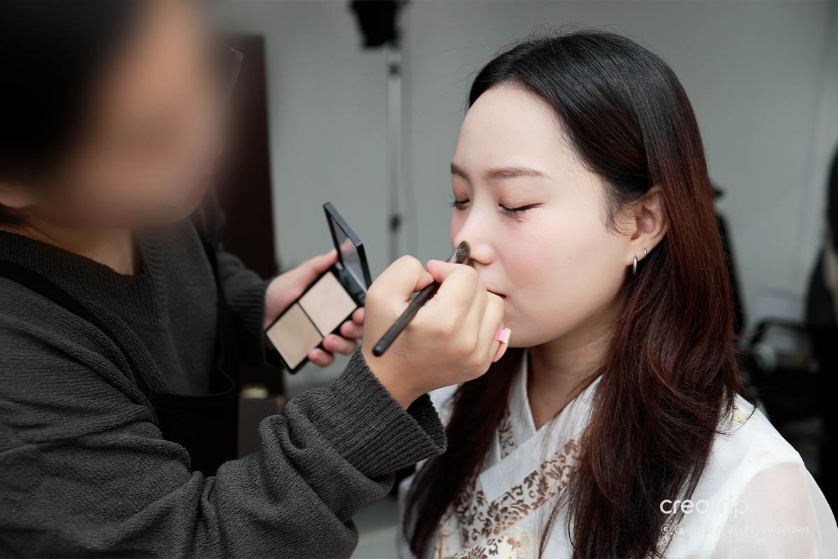 After finishing the eye makeup, the artist moved on to nose shading. For photo shoot makeup, adding a deep shading effect is key.
