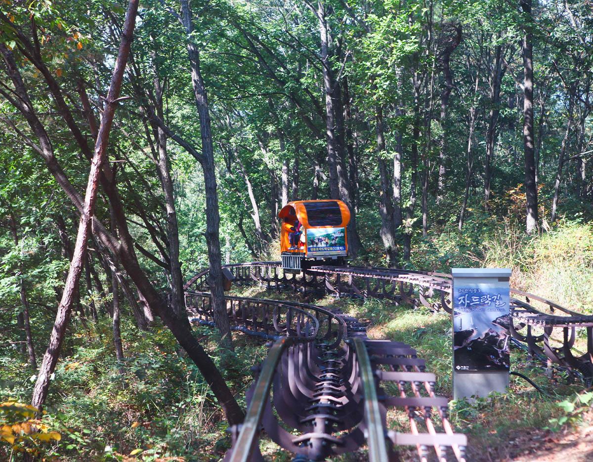 The 'Cheongpung Lake Monorail,' which slowly ascends and descends along the slope of Bibong Mountain, offers unique viewpoints of Chungpung Lake that can only be seen by riding the monorail. This attraction continues to draw visitors with its slow yet thrilling analog charm.