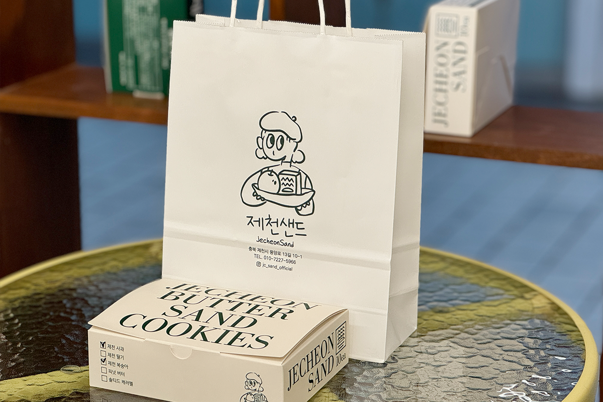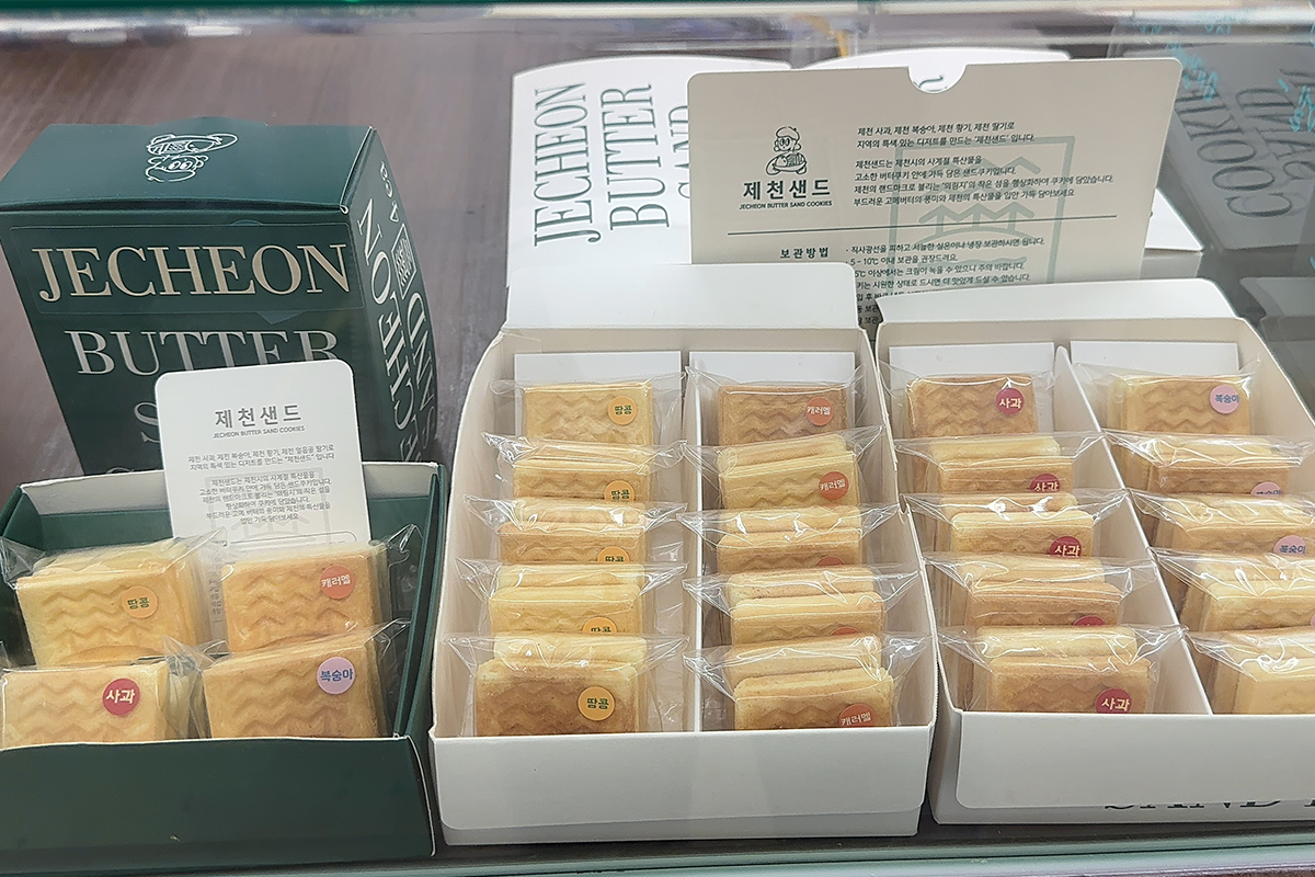 Lately, everyone visiting Jecheon seems to bring back this must-buy souvenir, so I decided to check it out too—'Jecheon Sand,' a hot item on Korean social media! These sandwich cookies are made with Jecheon’s local specialties and are designed to resemble the small islands of Uirimji, a popular tourist spot.