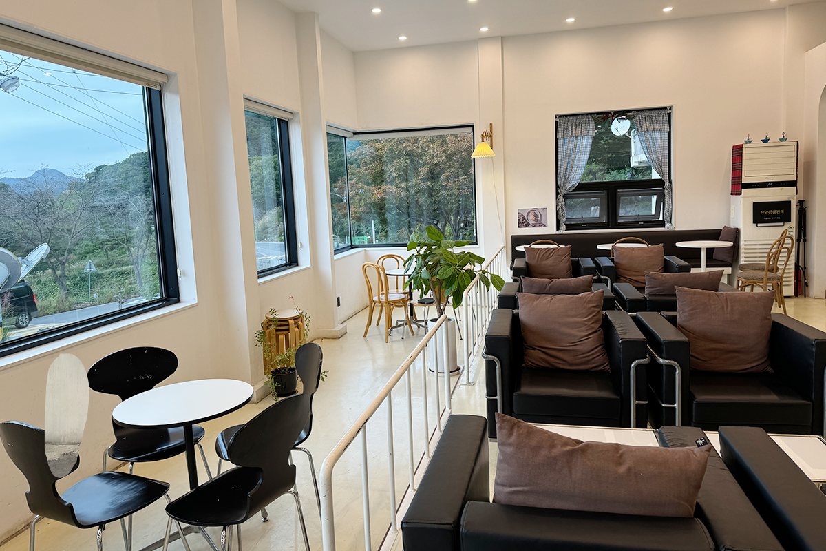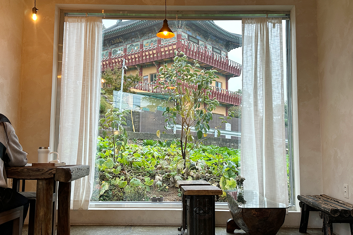 Let me introduce a cozy new cafe that opened last year near Jecheon Station! This small spot features a charming wood-toned interior, and through its large windows, you get a unique view of a cornfield and a temple.