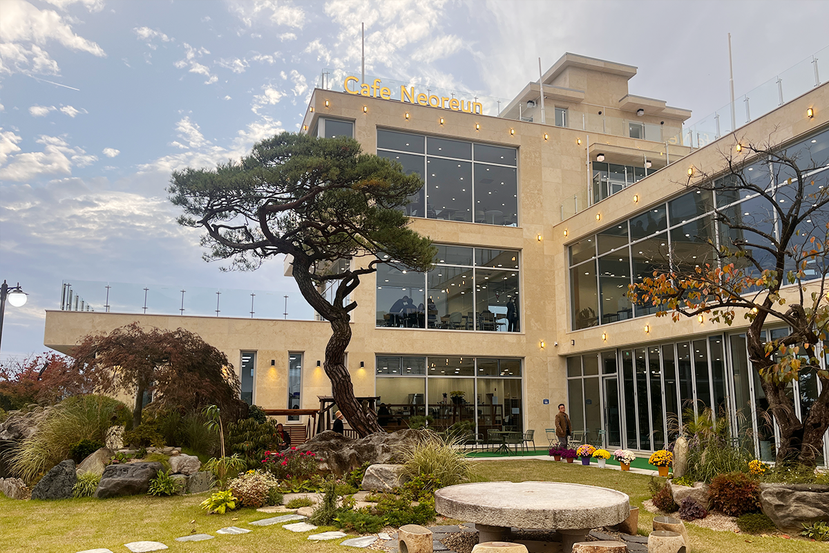 Lastly, let me introduce 'Cafe Neureun,' also near Cheongpung Lake. This four-story cafe with glass windows offers stunning views of the lake from any floor, making it a popular spot among Jecheon locals!