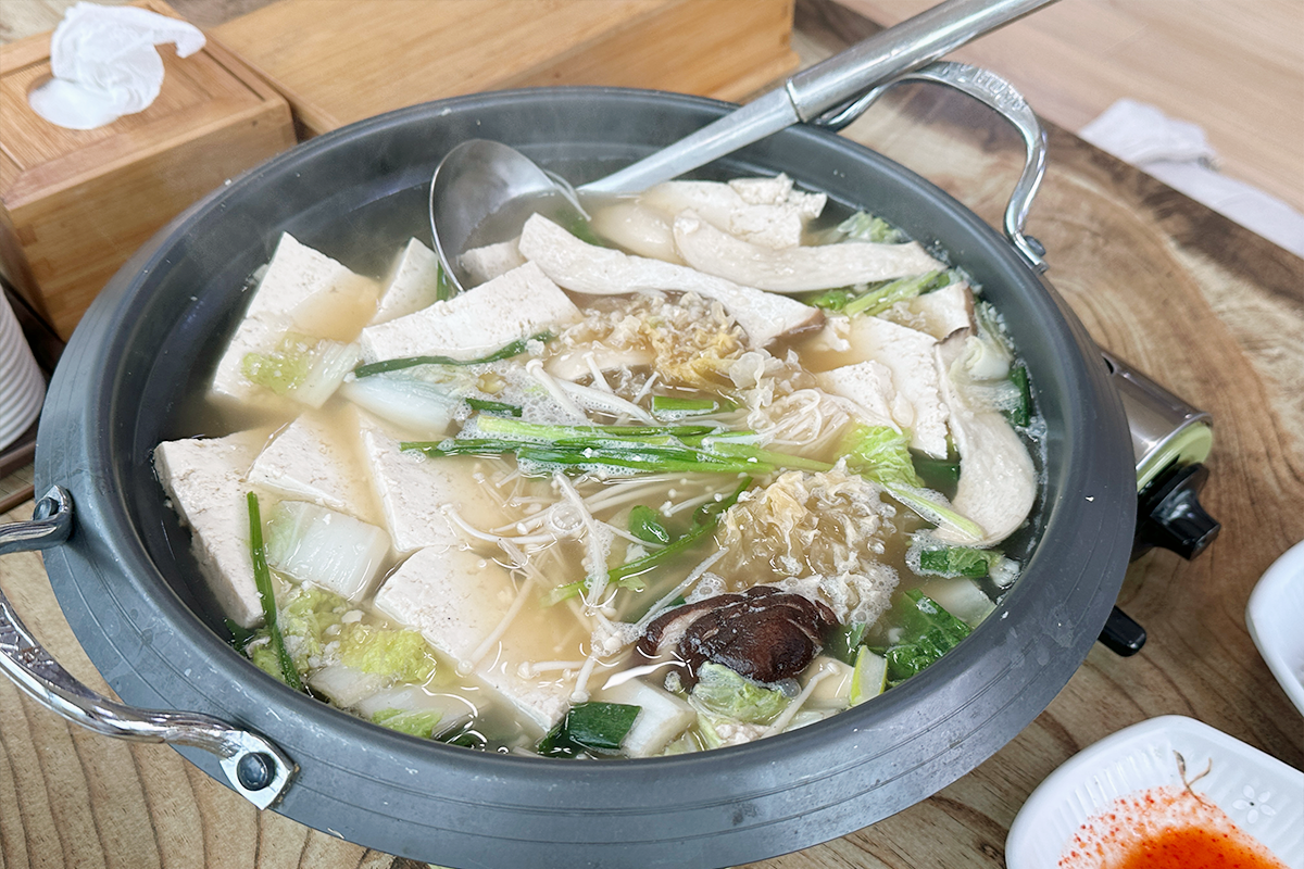 Their standout dishes are the Soft Tofu Mushroom Hot Pot and the Korean Beef Bulgogi Mushroom Hot Pot. I tried the Soft Tofu Mushroom Hot Pot, which had a light, flavorful broth filled with tofu and mushrooms. You can adjust the seasoning to your taste, and though it’s a generous portion for two, it was so tasty we finished every bite.