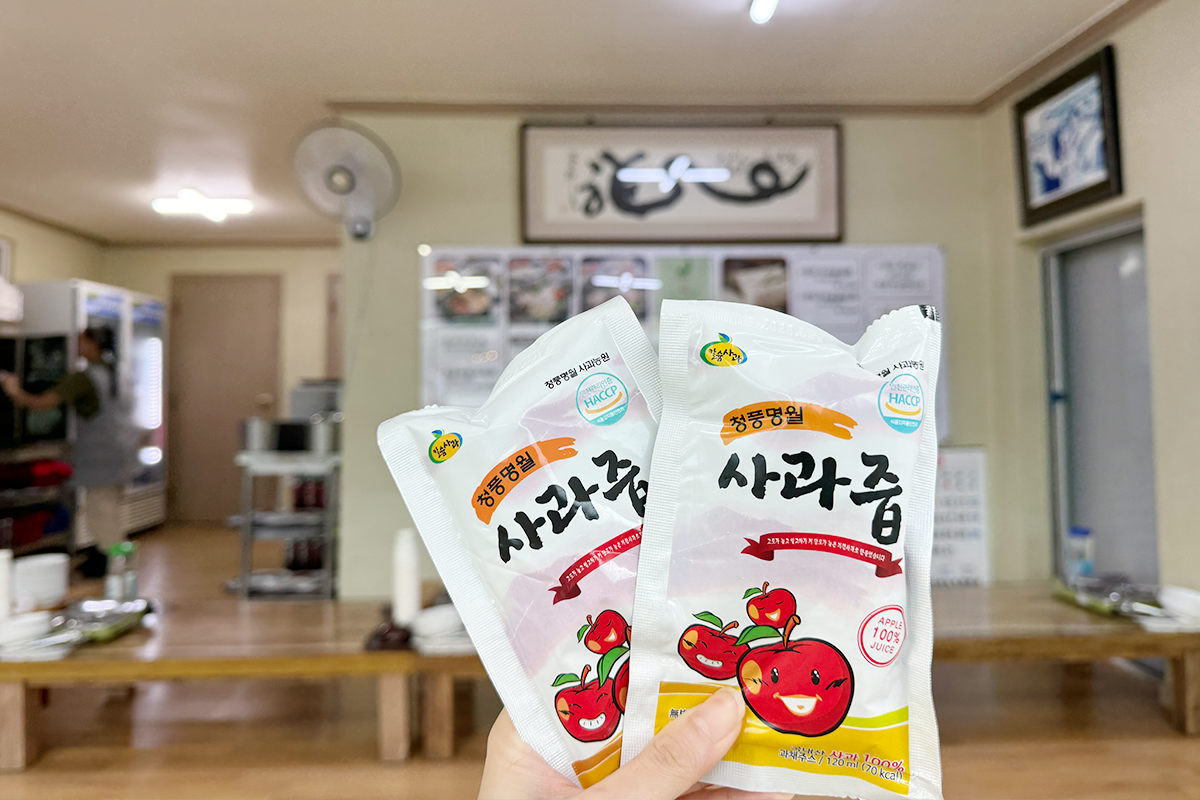 After the meal, they serve sweet apple juice as a refreshing dessert. With a welcoming owner and friendly staff, it’s a perfect spot for foreign tourists. Plus, it’s near the Cheongpung Lake Monorail, so be sure to stop by on your trip!