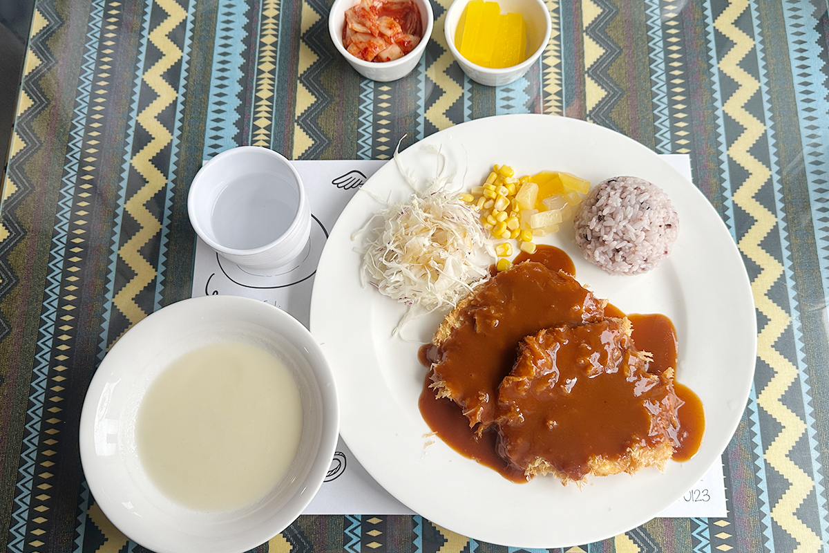 The signature handmade pork cutlet, priced at 12,000 KRW, includes soup, two thick and crispy cutlets, rice, salad, and a drink. I tried the cheese pork cutlet, and it was loaded with cheese!