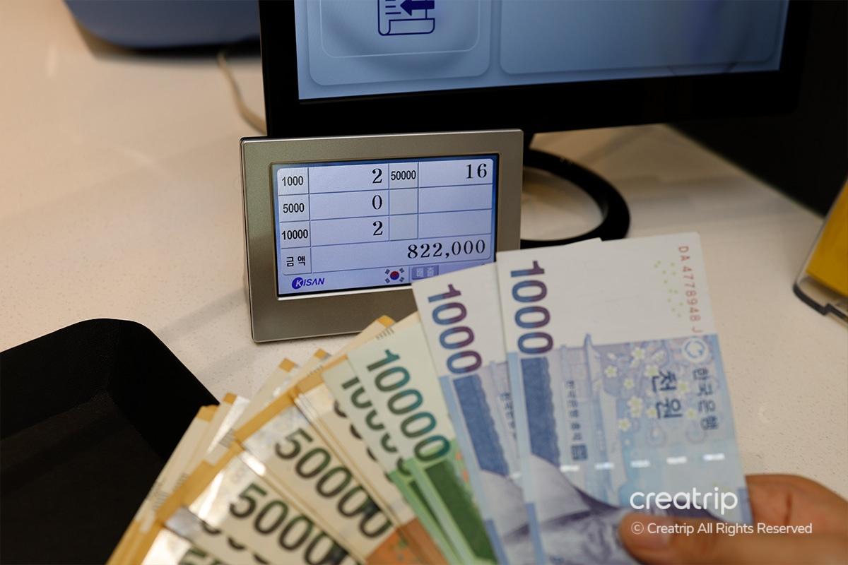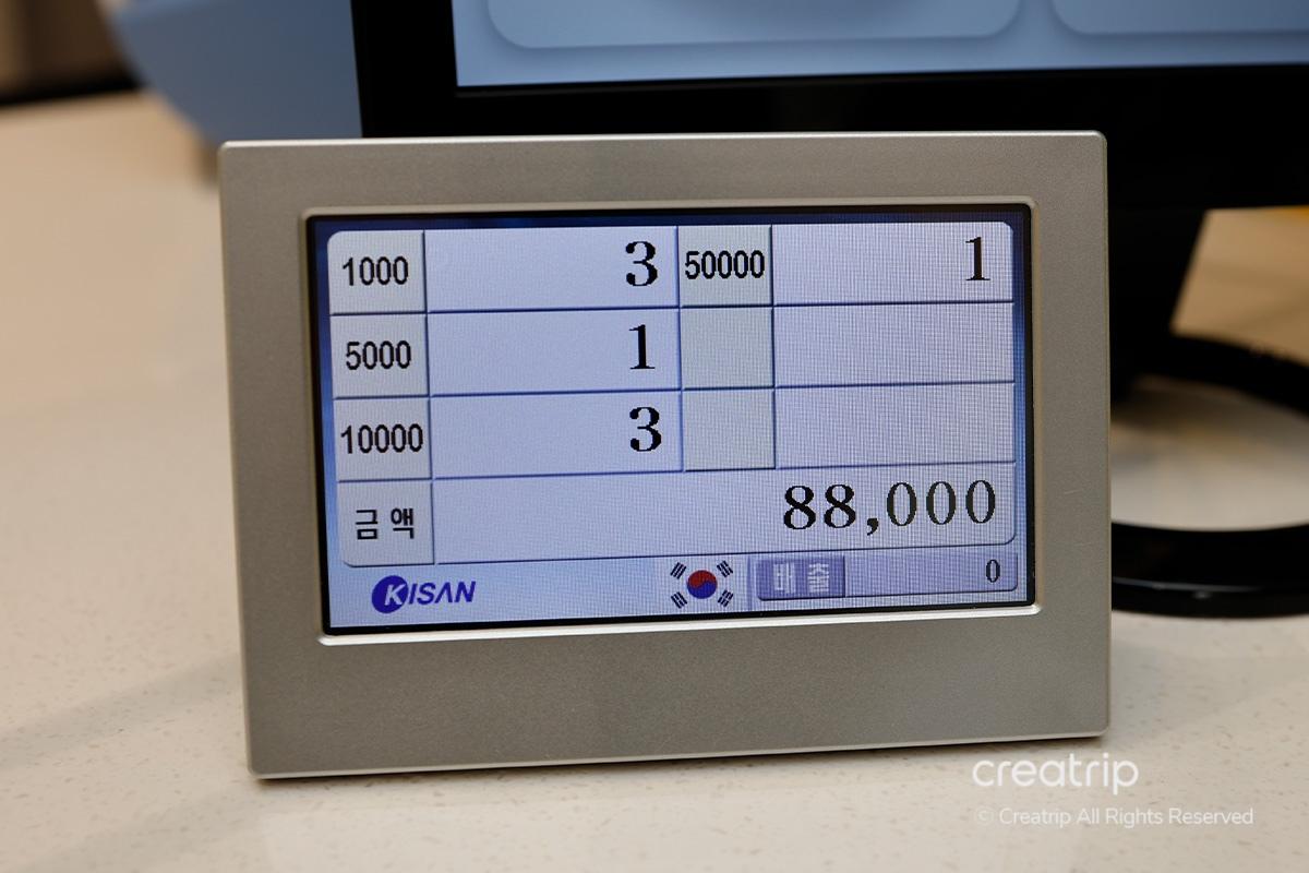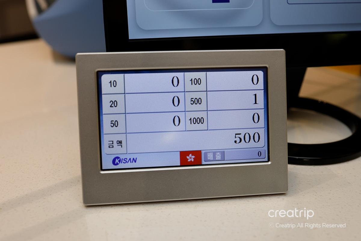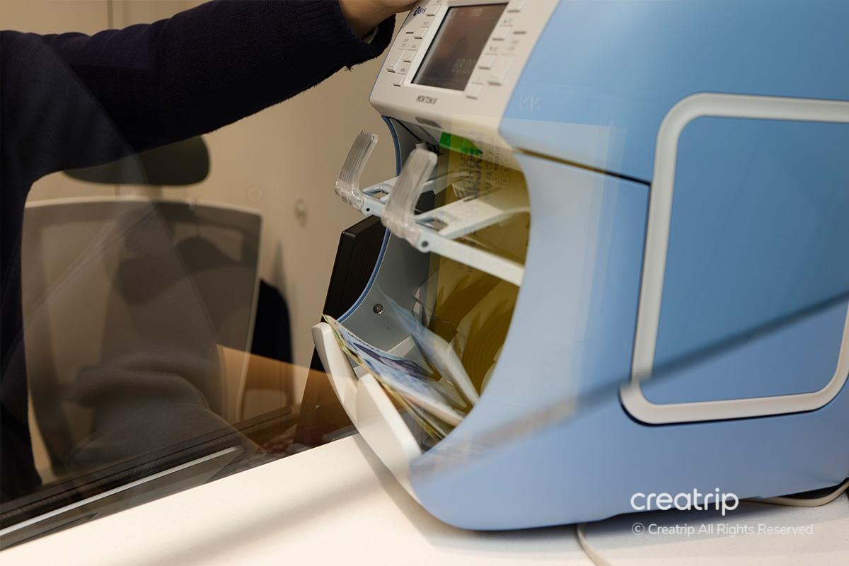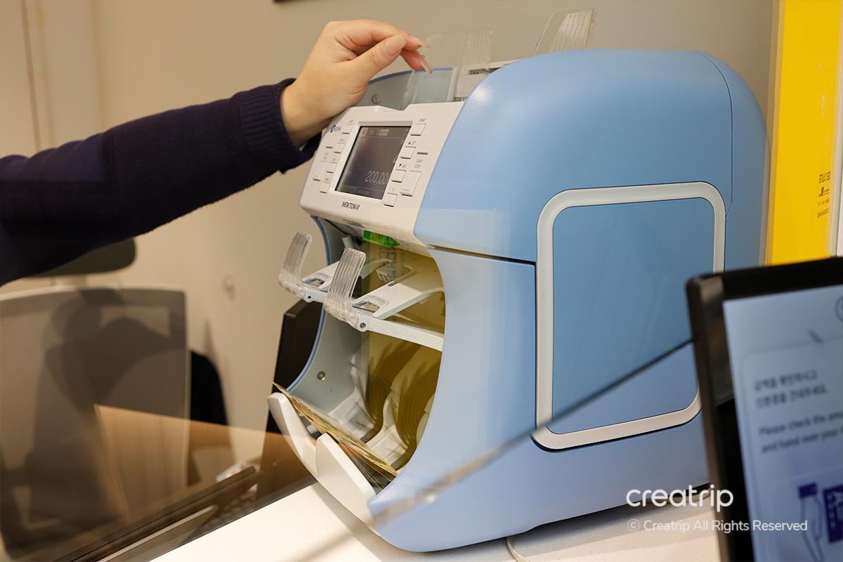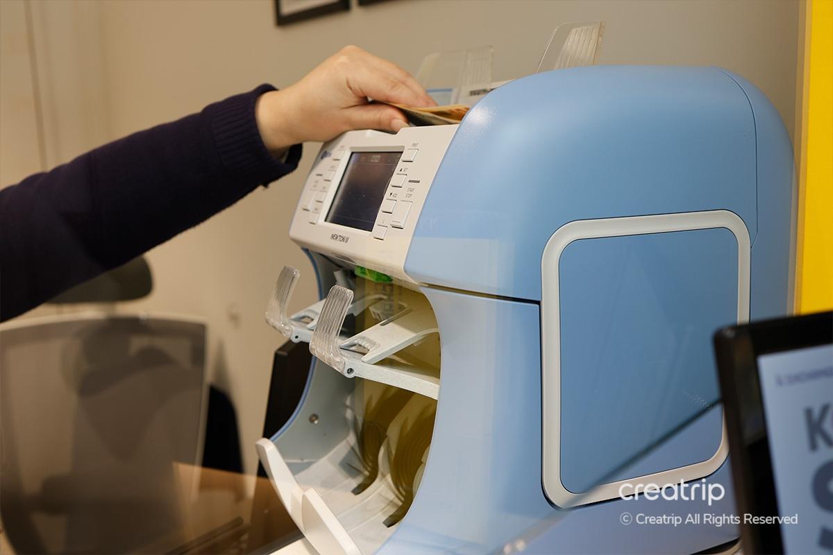 Use the machine inside the counter to quickly count the bills and prepare the amount in Korean Won according to the exchange amount.