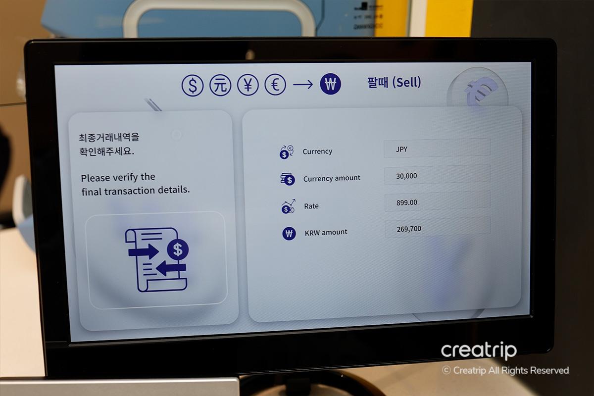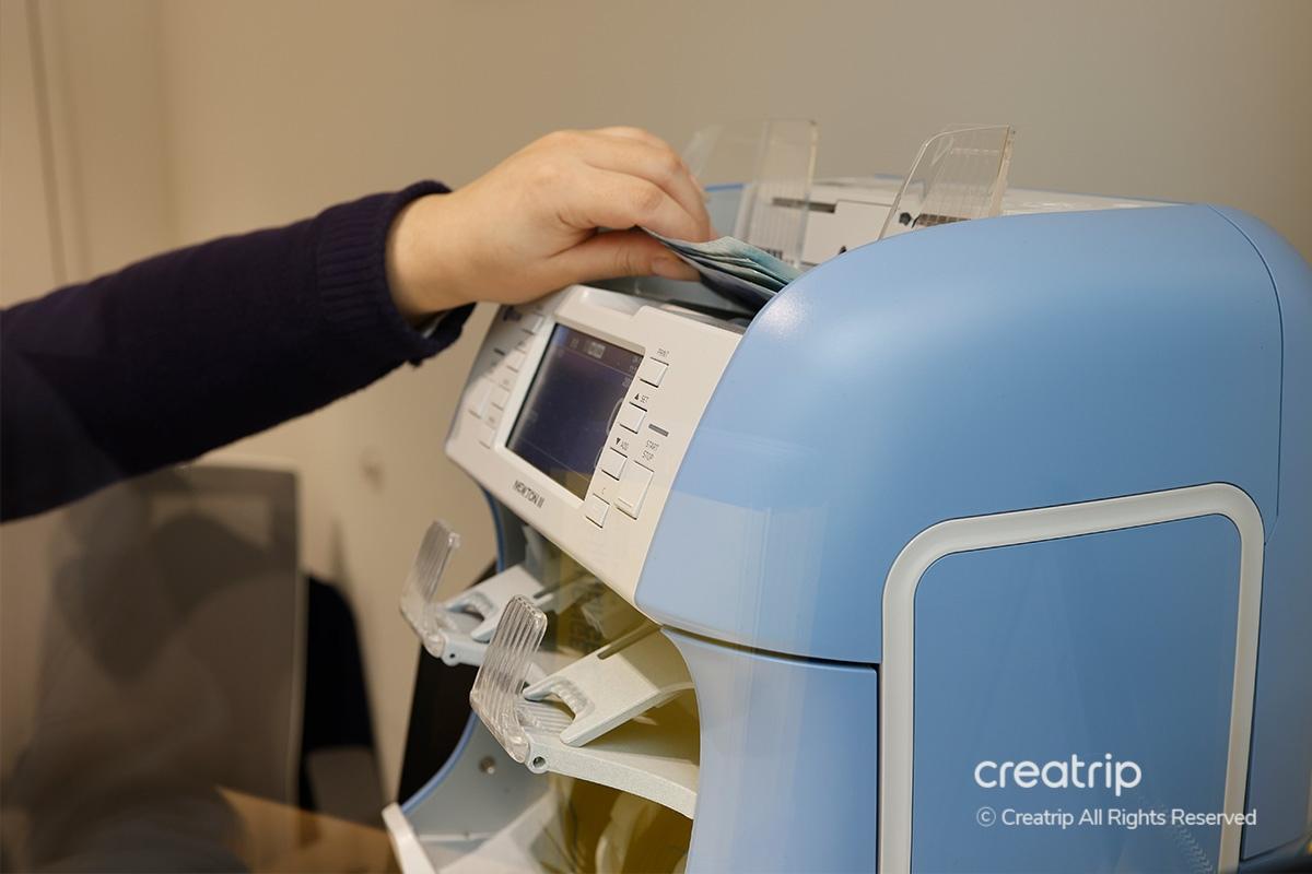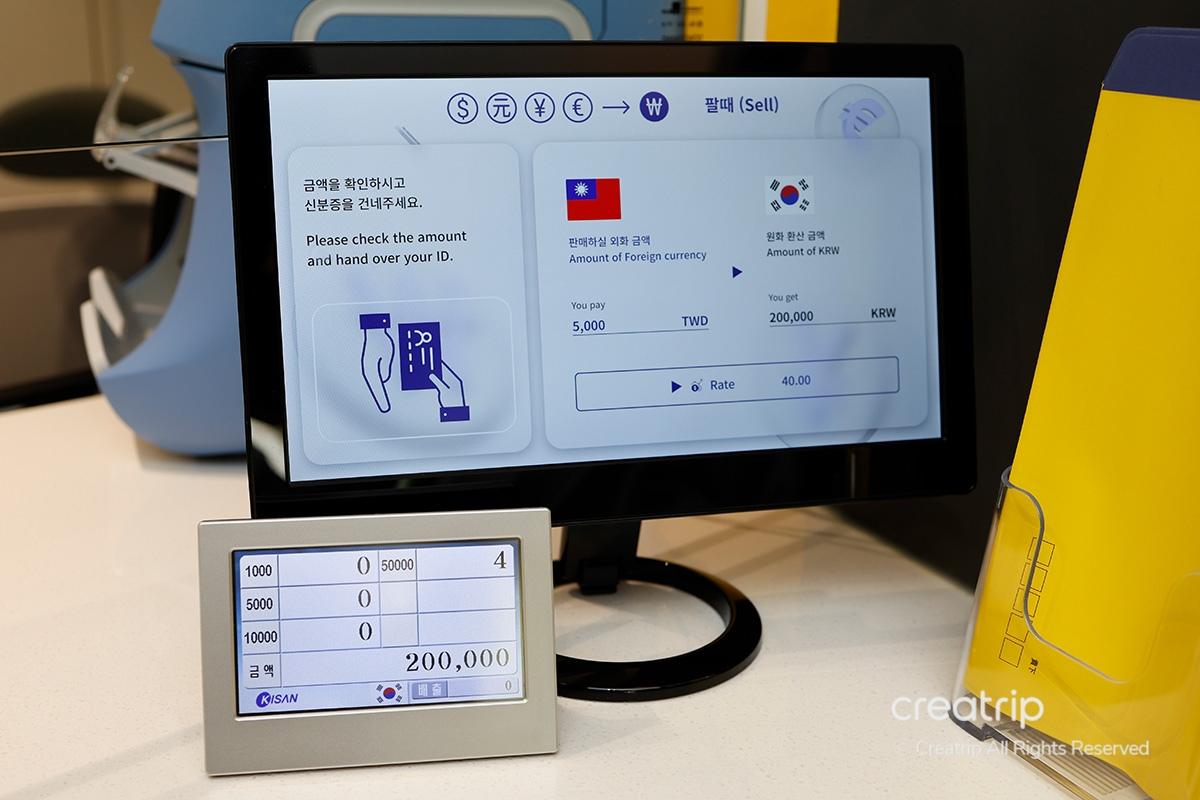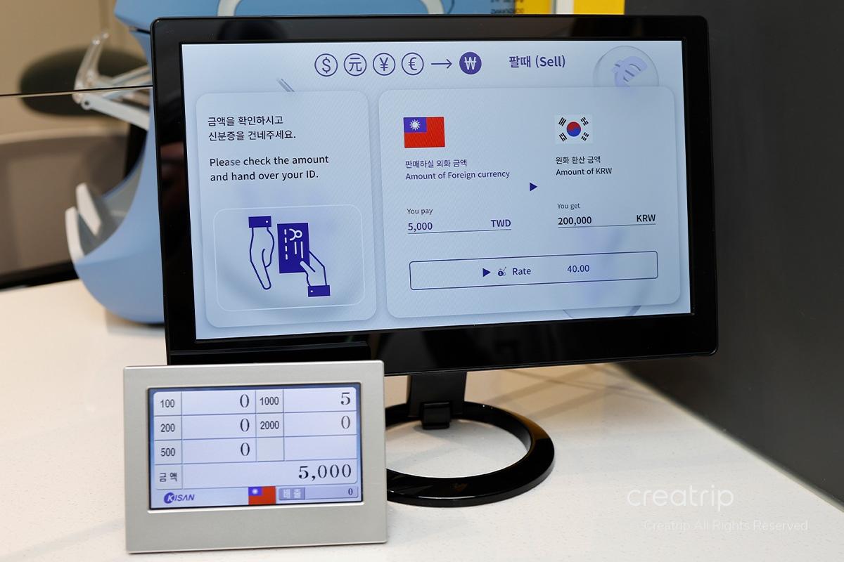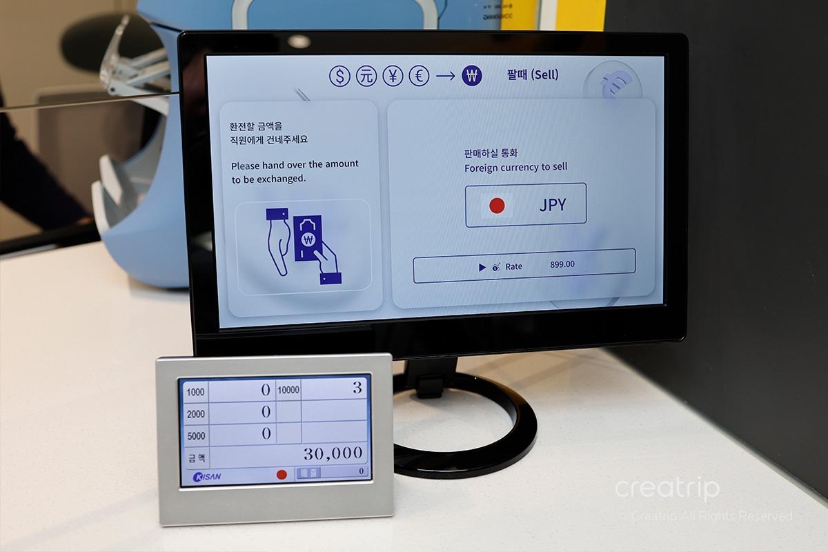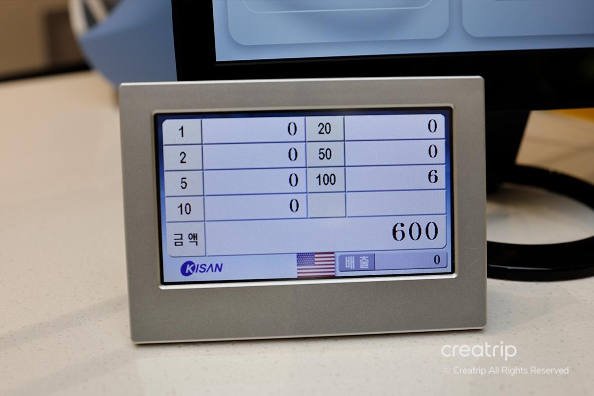 Use the machine inside the counter to quickly count the bills and prepare the amount in Korean Won according to the exchange amount.