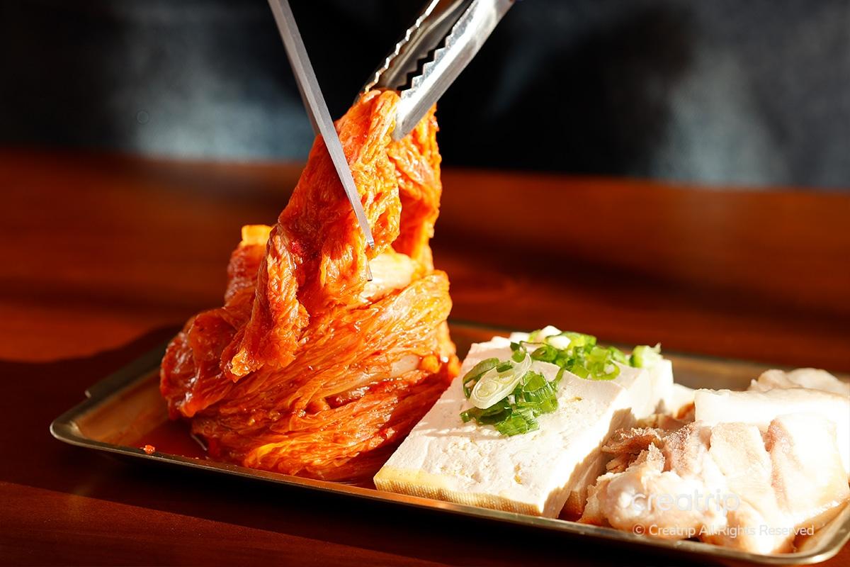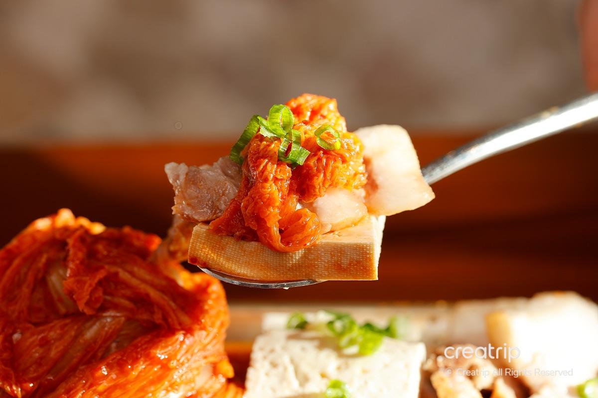 The combination of tofu, boiled pork, and kimchi harmonizes very well with the flavors and textures of each ingredient coming together.
