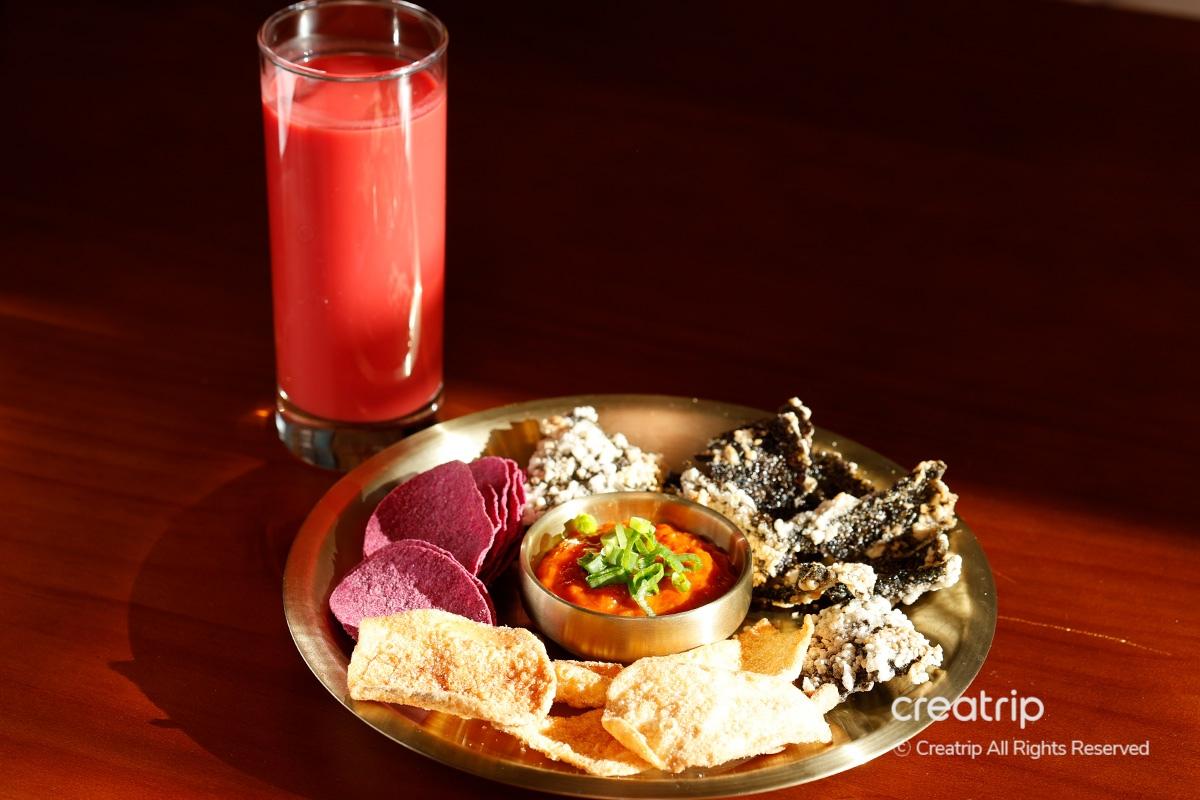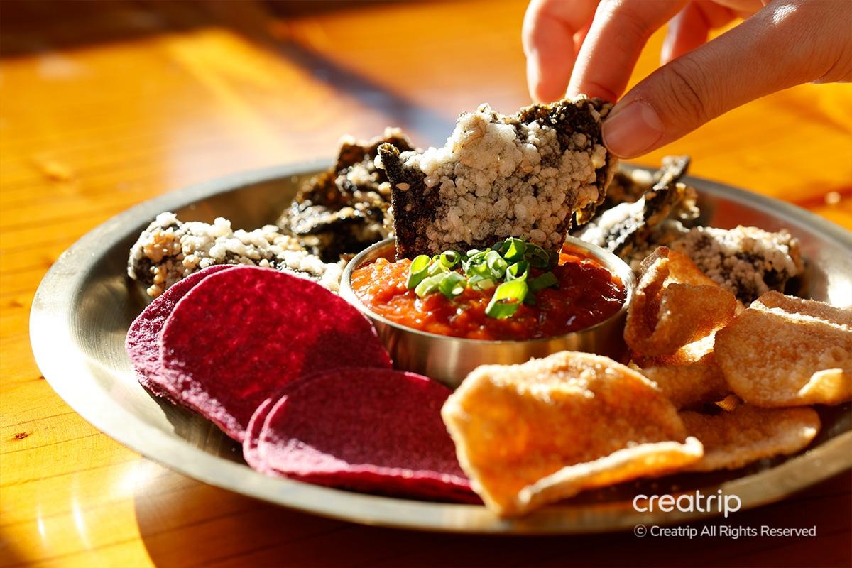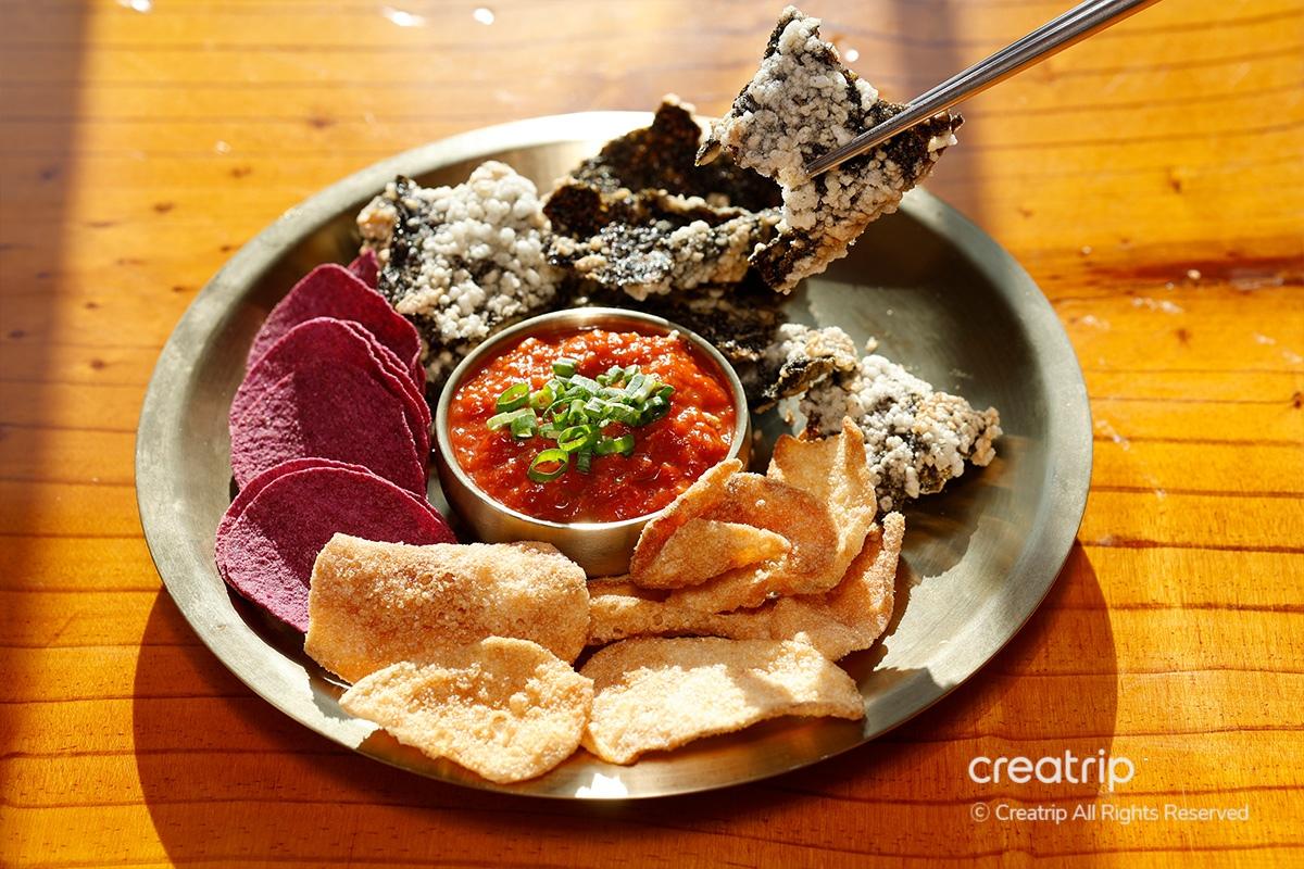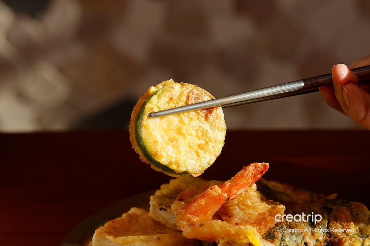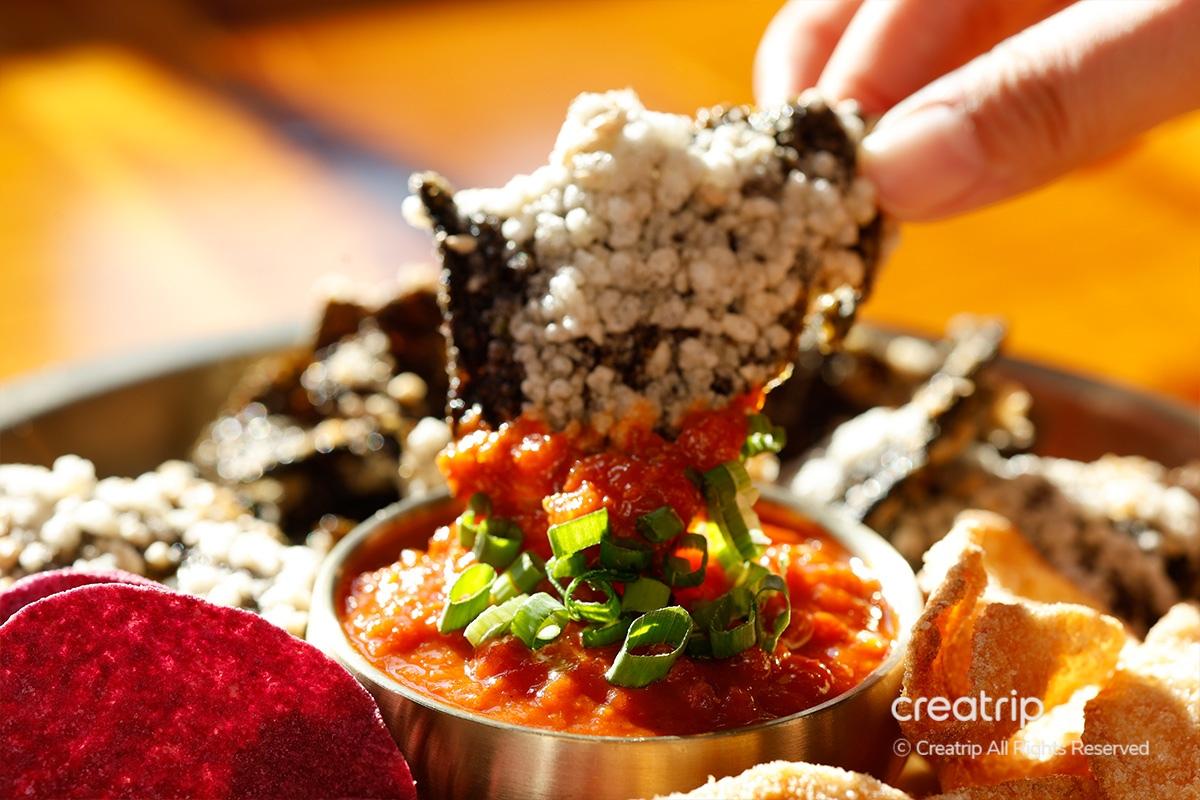 You can dip various Korean-style crispy vegetables in the gochujang sauce. Bugak is a side dish made by coating ingredients with glutinous rice paste, drying them, and then frying them in oil. It is quite crispy and you can taste the original flavor of the ingredients.