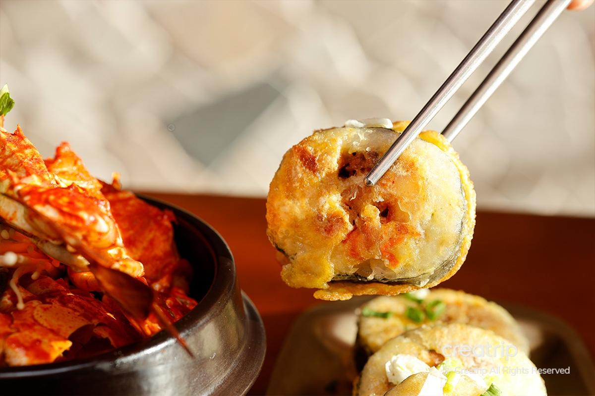 Kimbap jeon can really be described as one of the truly Korean foods. Coating kimbap with egg batter and eating it grilled like a pancake is truly a unique Korean cooking method. The taste is more nutty and warm compare to regular kimbap.