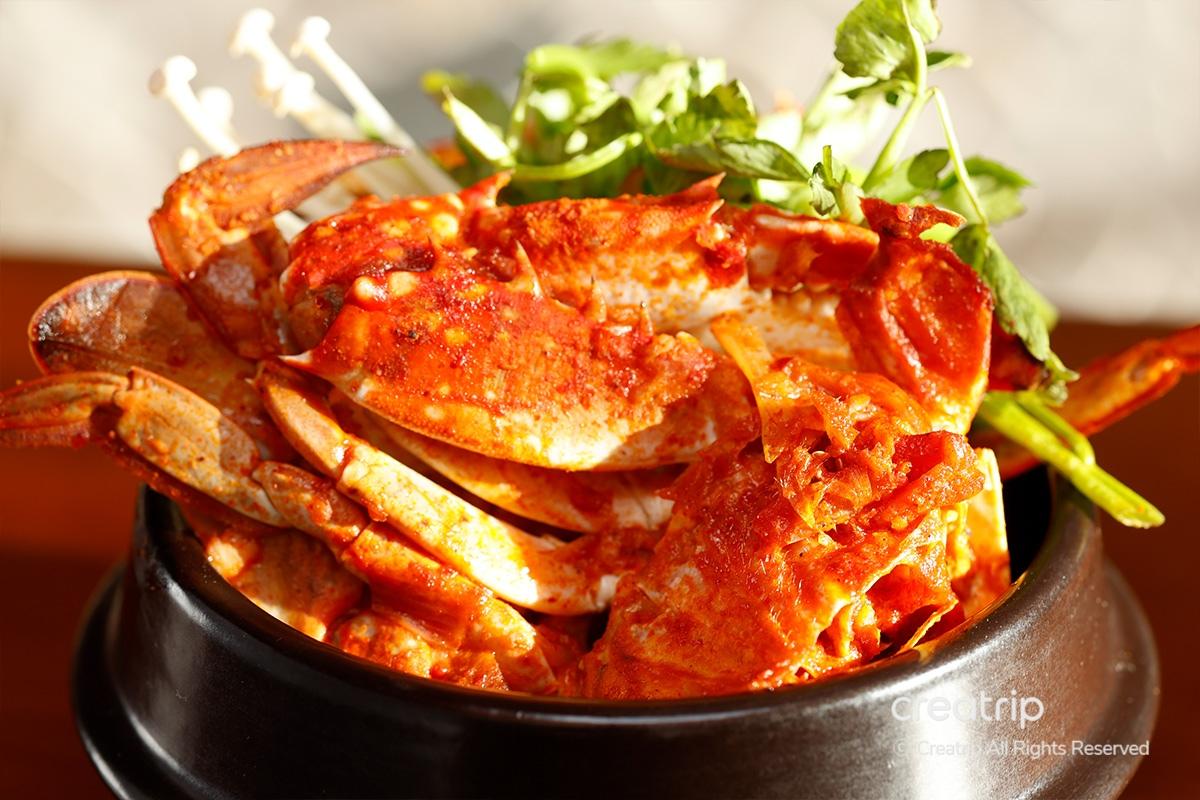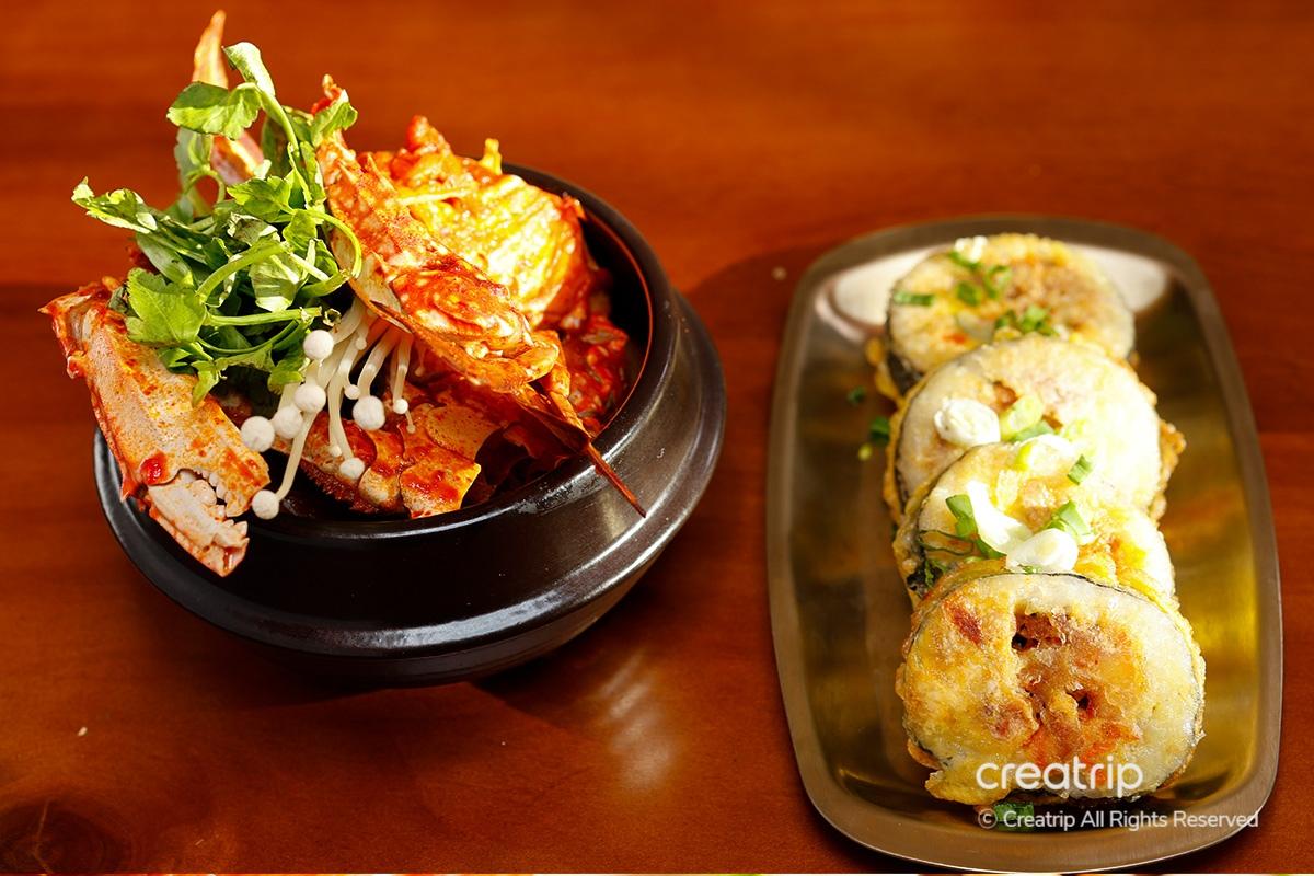 Lastly, I had a spicy crab stew and savory gimbap pancakes. The crab and chicken were boiled with spicy seasoning, and it was amazing.