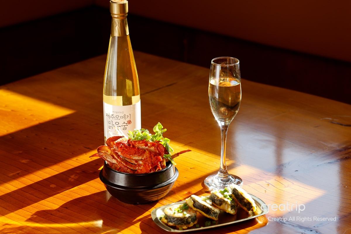 Omegi clear soju & spicy blue crab soup with kimbap jeon