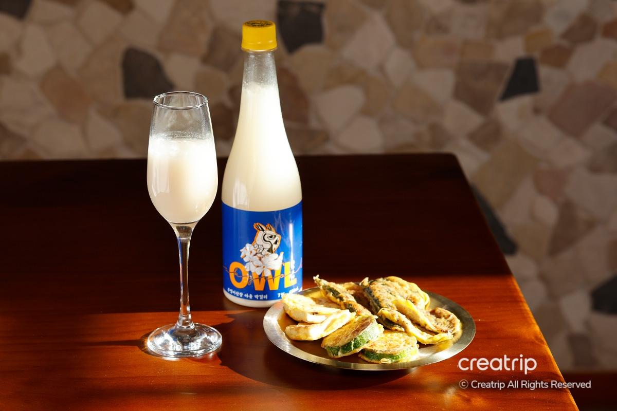 Owl Makgeolli is smooth with a slightly sharp carbonation and a subtle sweetness. The makgeolli cleanses the greasy taste from the pancakes.