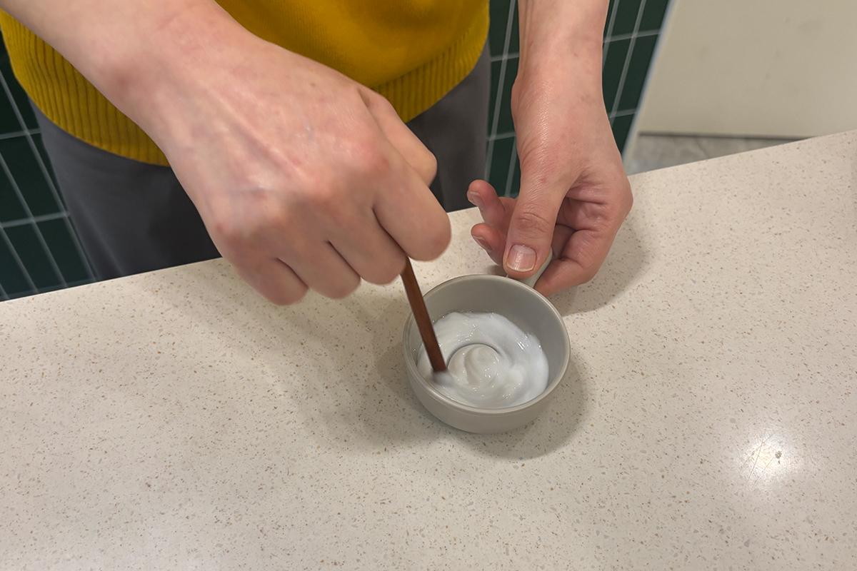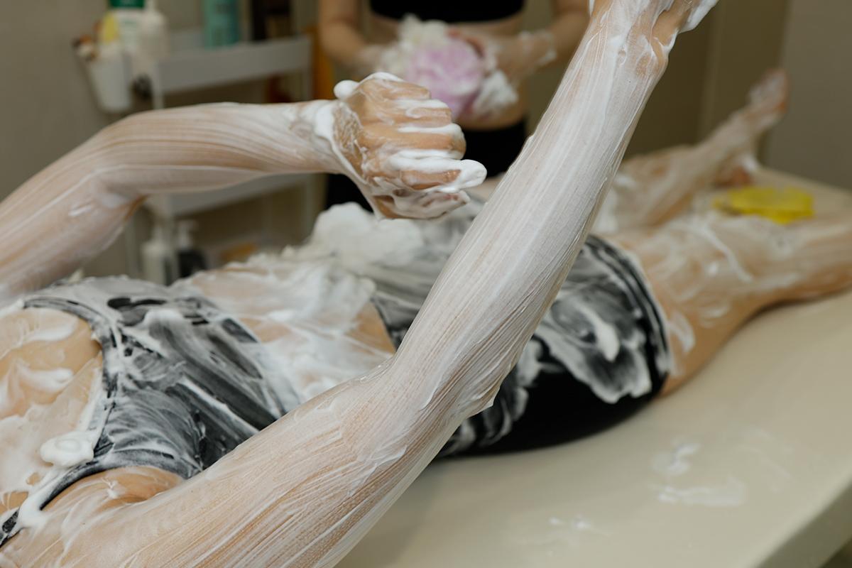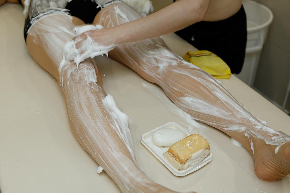 After the timing, the model chose to proceed with the mochi bubble cleansing. This mochi bubble body wash is said to be developed directly by the owner.