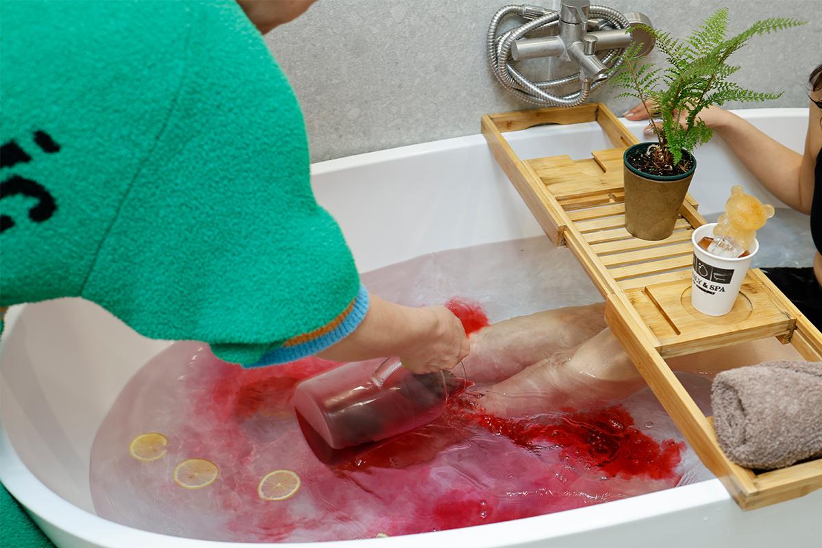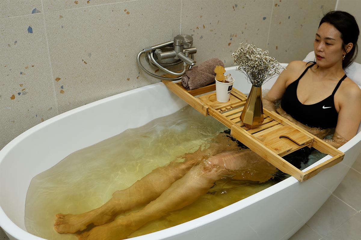 Just like the hibiscus bath bomb, a staff member came and added freshly brewed mugwort tea to the bathtub.