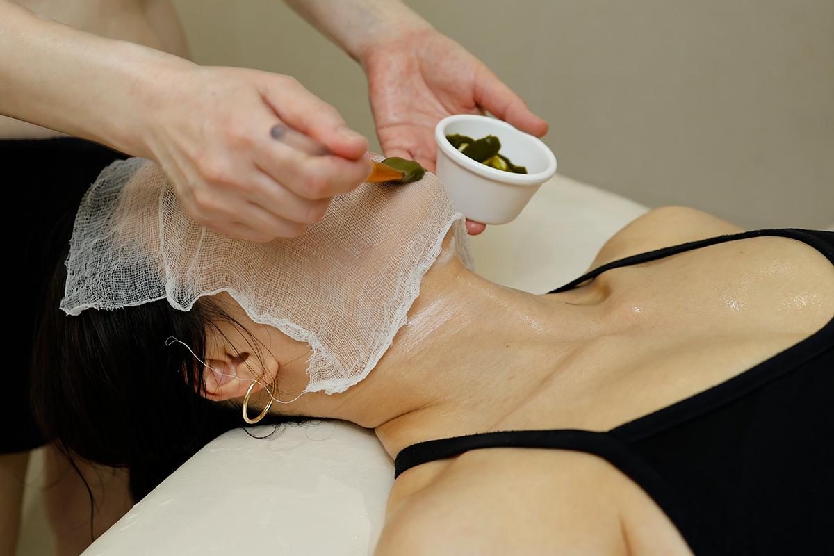 First, they placed a gauze on my face and generously applied a natural green tea pack on top. To enhance absorption, they covered my face with plastic.