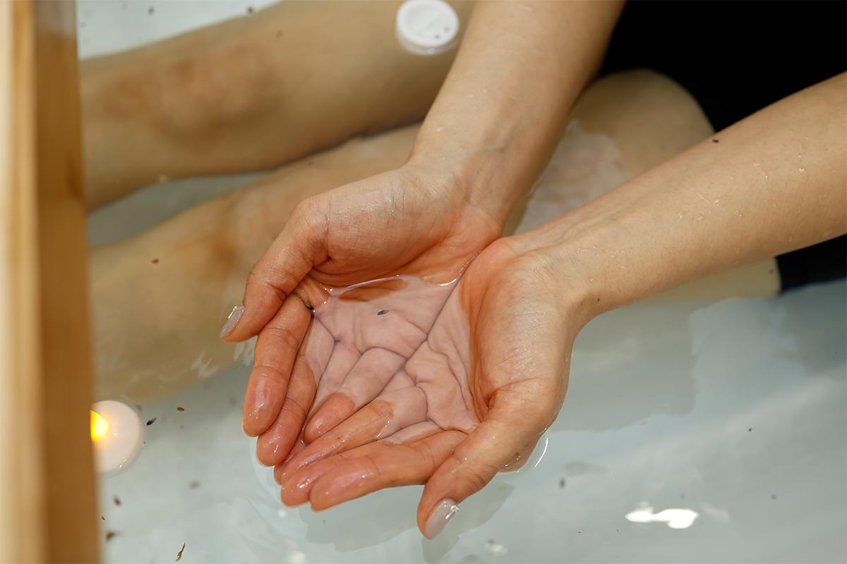 After putting the salt in the water, gently rubbing the floating lavender with your hand allows the scent to spread more deeply, and it was healing in itself.