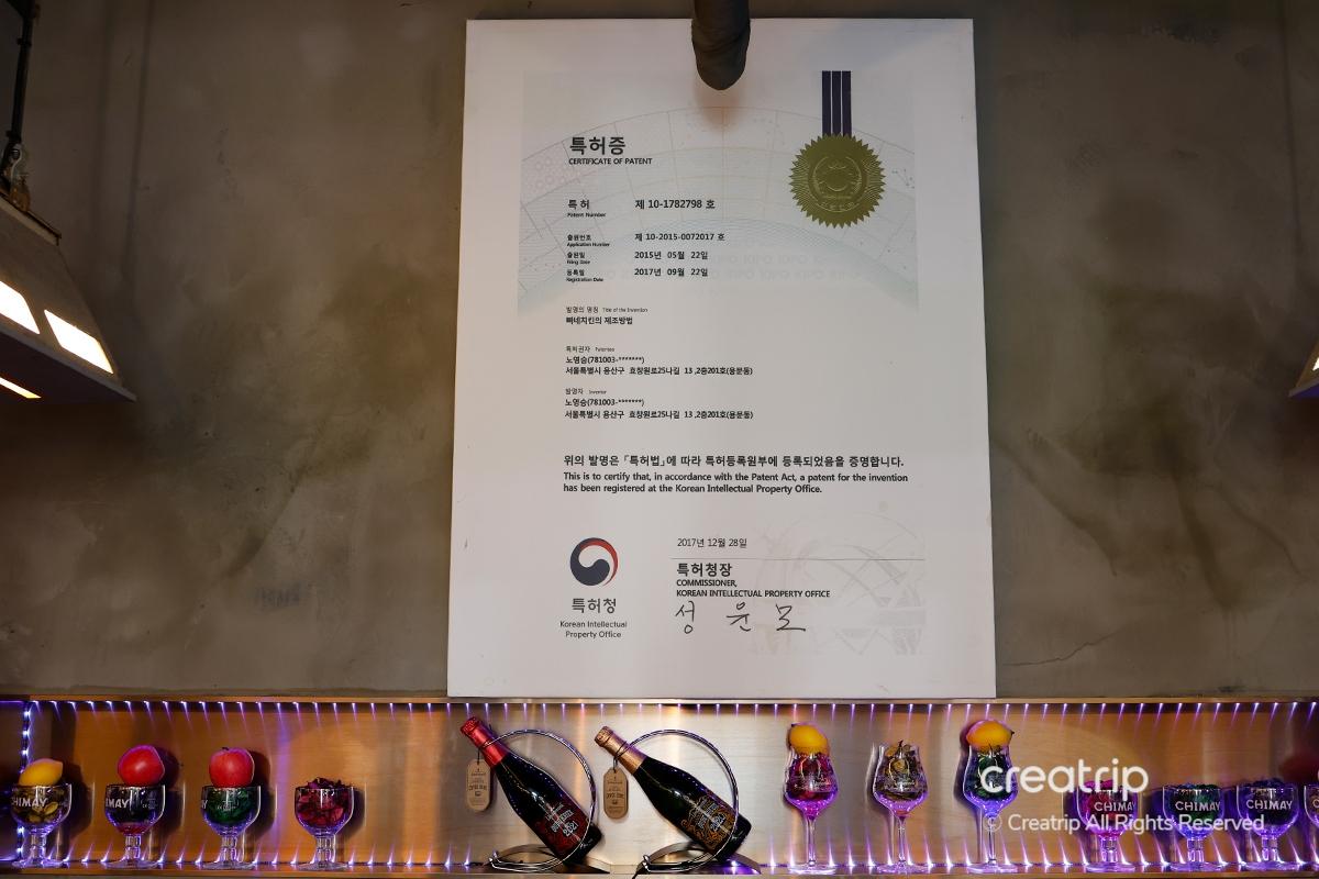A patent certificate for the method of making the signature menu item, Pane Chicken, at '꼭그닭 Gangnam Branch' and a certificate of commendation for efforts to improve food hygiene standards were displayed.