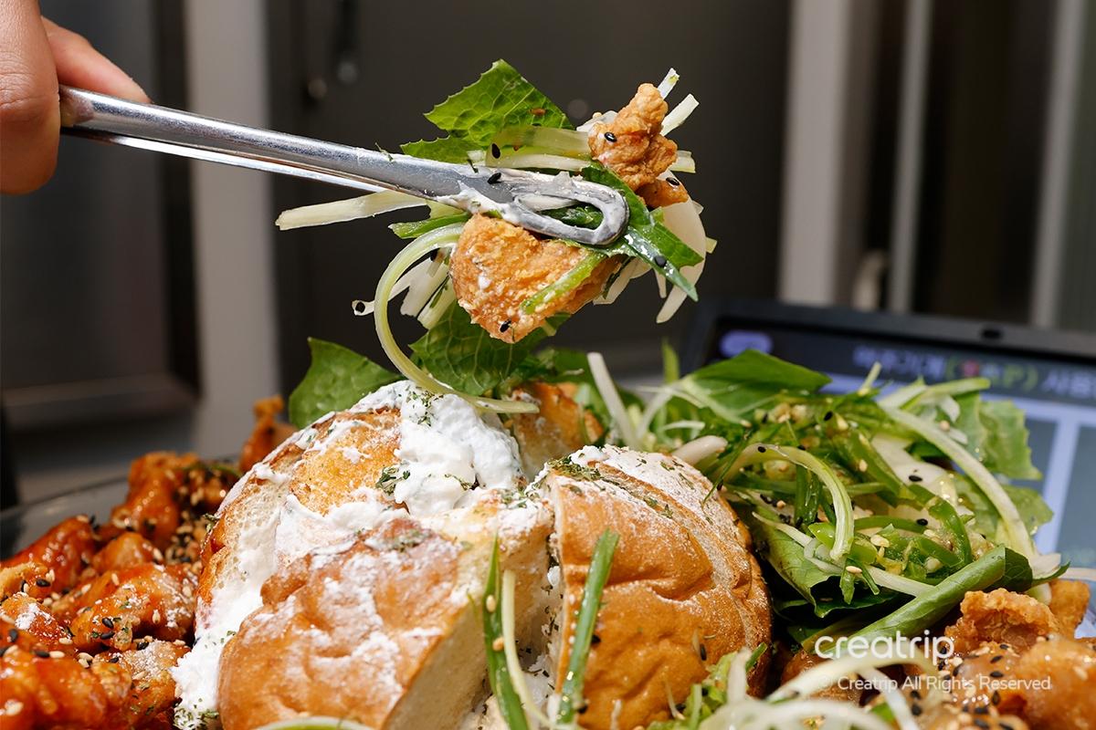 The editor ordered the signature menu items: handmade Pane Chicken, handmade Pico Chicken, Caesar salad, and tteokbokki. Doesn’t it all look really plentiful and delicious?