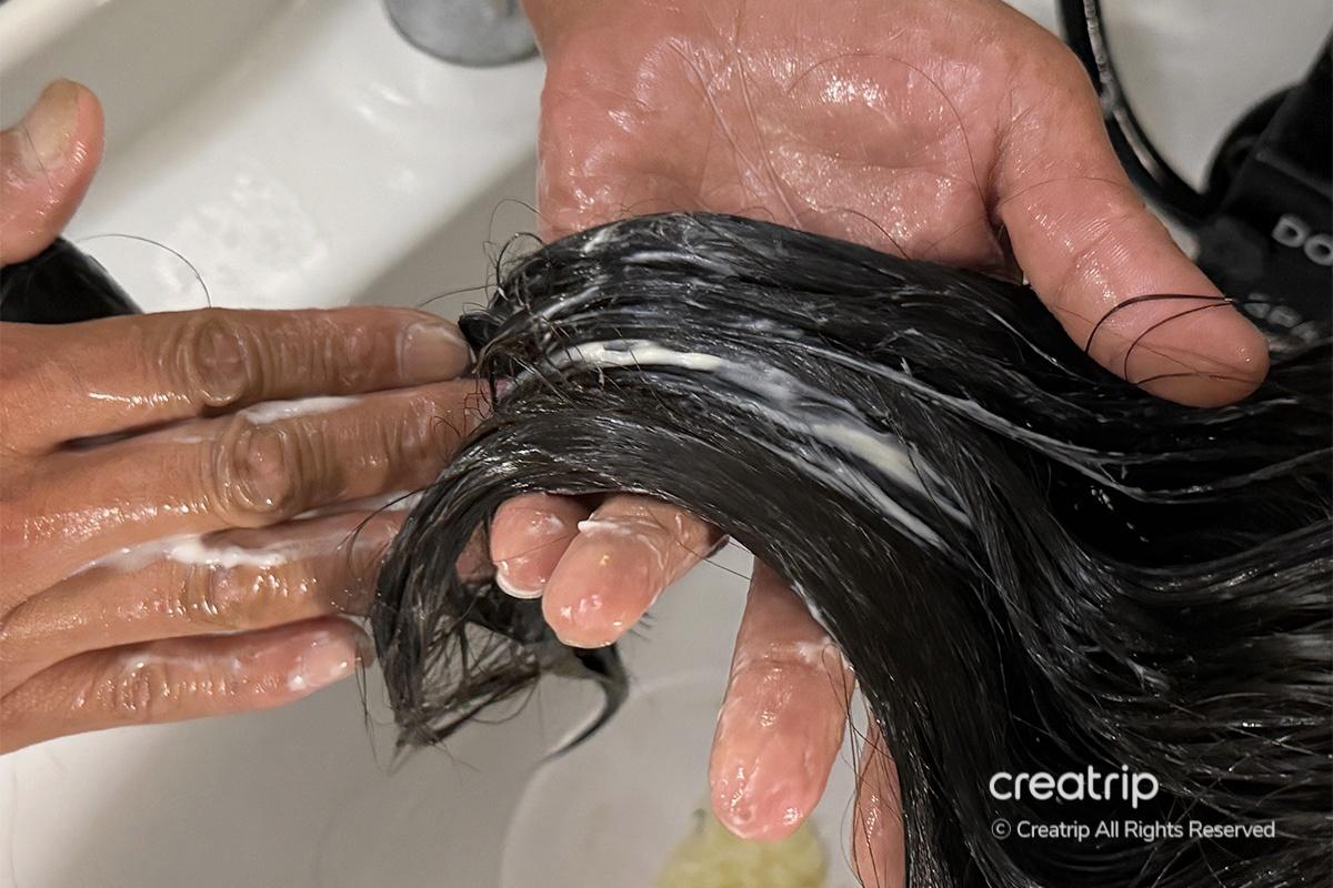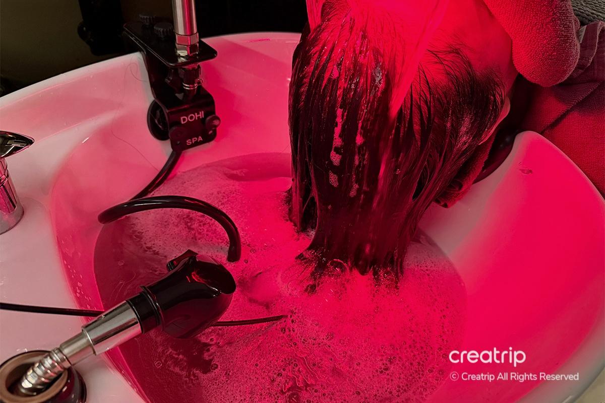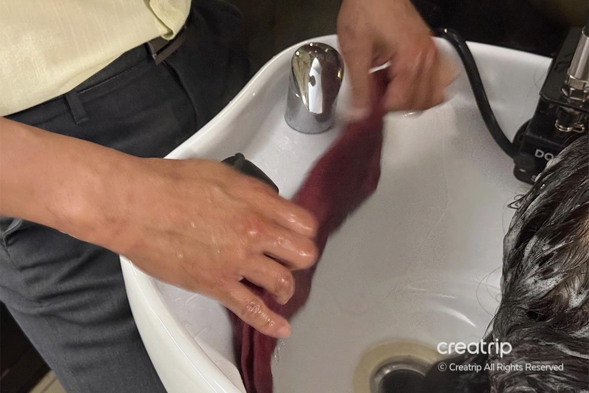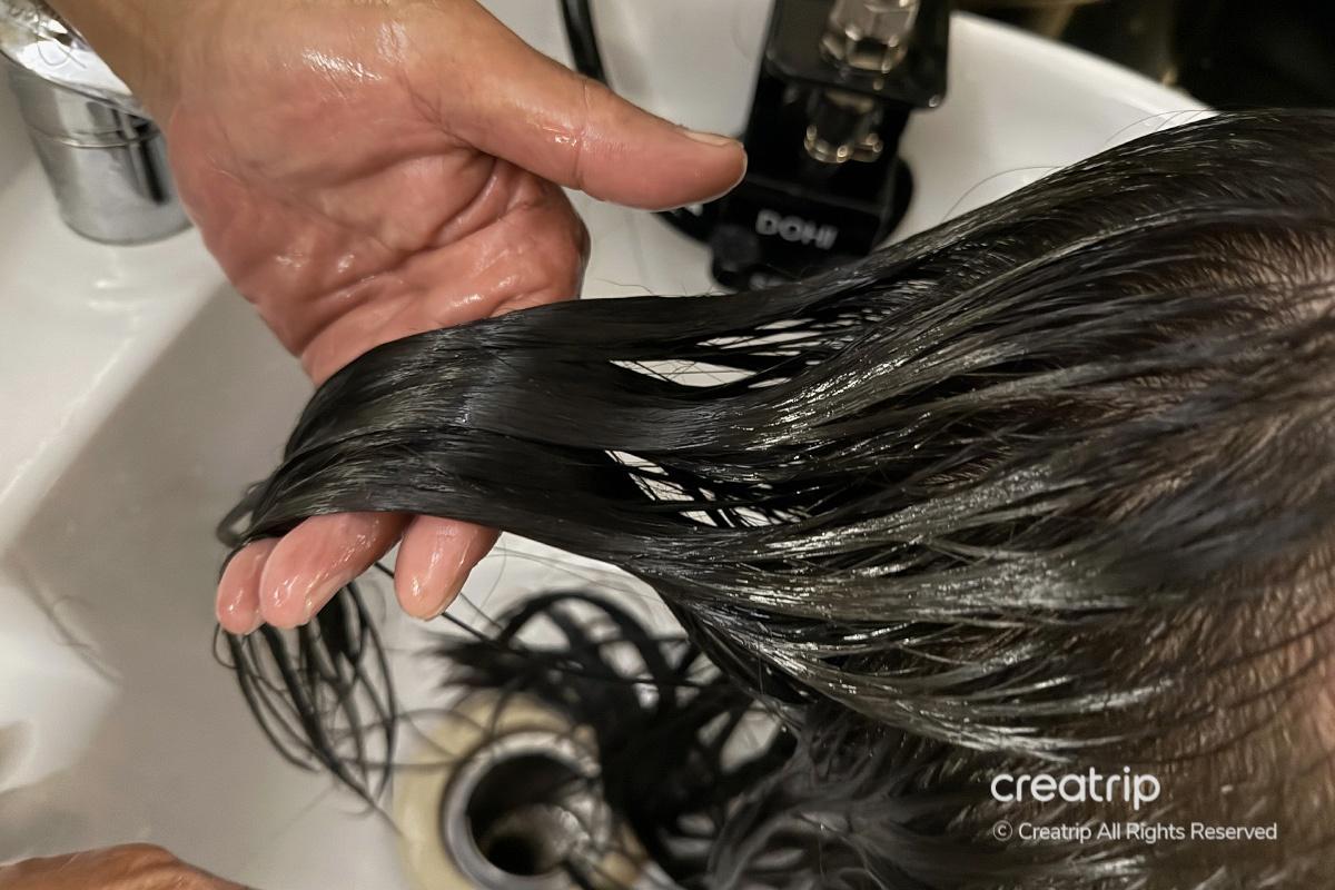 Back in the shampoo room, they placed a hot towel on my neck to help improve blood circulation from the neck to the scalp. It felt incredibly relaxing, and I could feel the tension melting from my head down to my neck. They then washed my hair gently with lukewarm water.