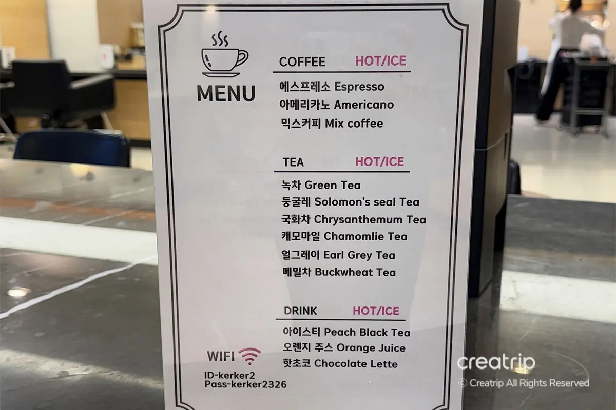 This is the beverage menu at the salon. Just pick your favorite drink and a staff member will prepare it for you right away. They offer coffee, tea, juice, and more, giving it a cozy café-like vibe that makes the experience even more enjoyable. The Wi-Fi information is listed at the bottom of the menu, so you can easily connect if you need internet during your treatment.