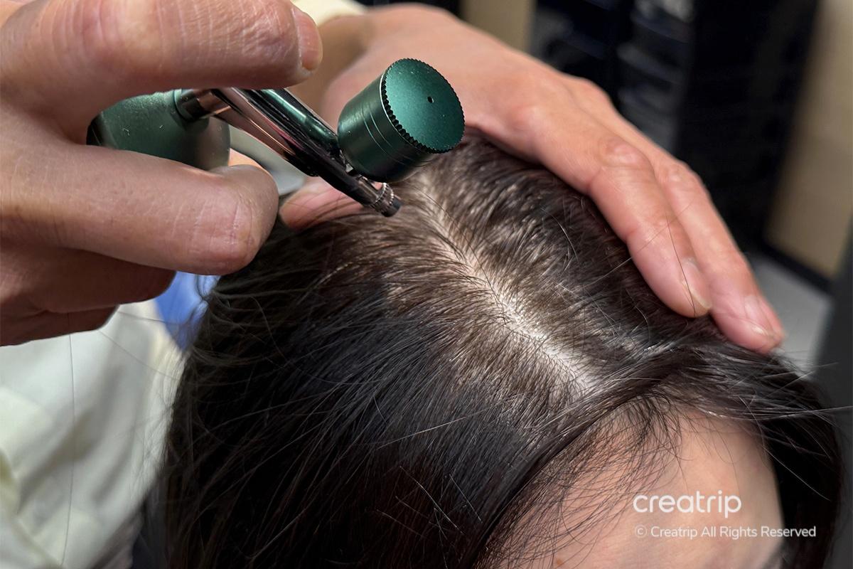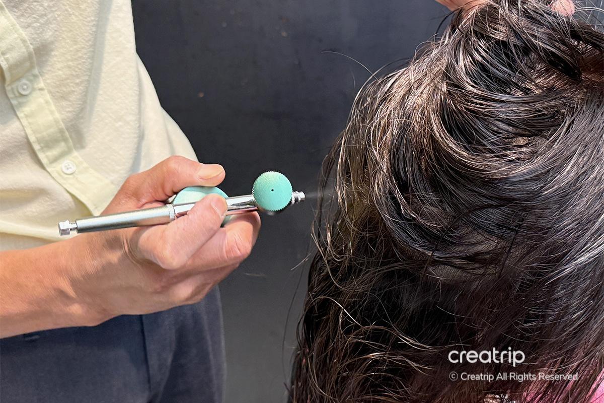 Next, they used a negative ion mist to further soften the dead skin cells. Rather than directly touching the scalp, the mist gently treated the area, making the process even more comfortable and safe.