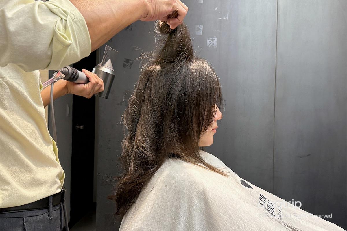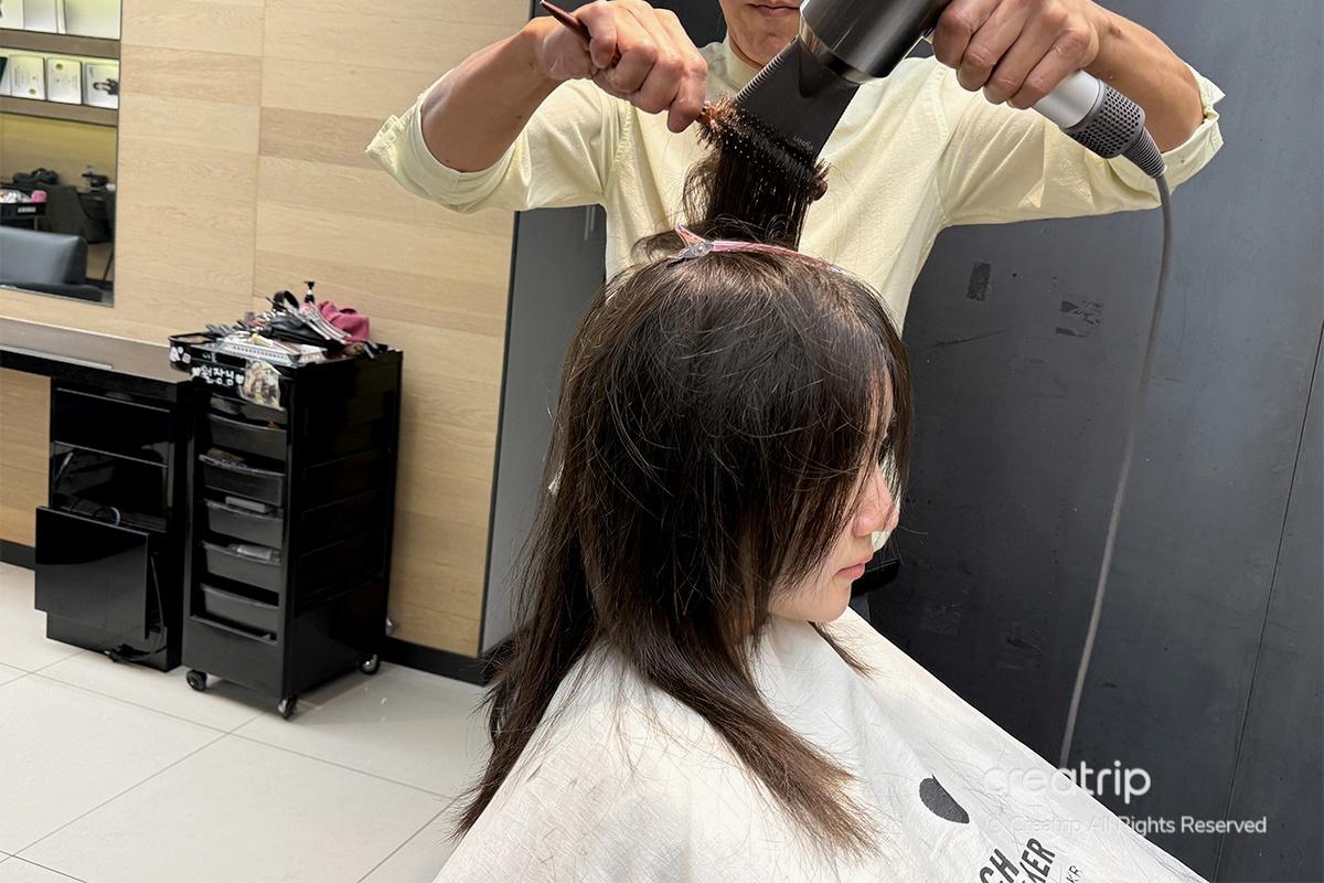 After carefully checking the dye, we moved to the shampoo room to rinse it out completely. While washing, they made sure no dye residue was left and massaged my neck and scalp with warm water. It felt incredibly refreshing and relaxing. This step also helps relieve muscle tension and promote blood circulation, making it feel even more special and beneficial for scalp health.