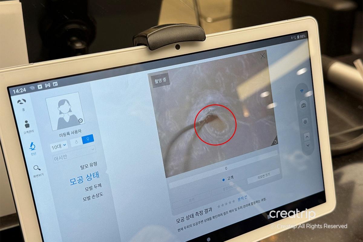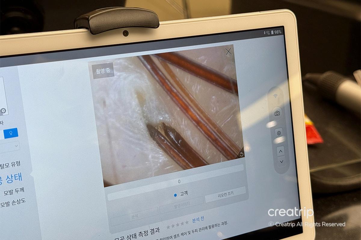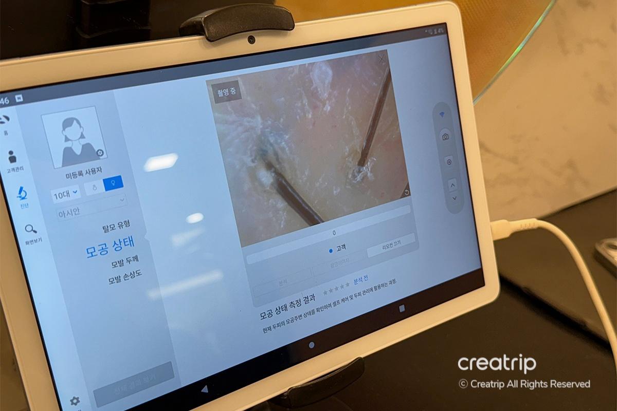 Next, they measured my scalp temperature. Since I tend to have a lot of body heat, my scalp was on the higher side. The optimal temperature is usually around 34–35°C, but mine was over 36°C, which made me realize even more how important proper scalp care is.