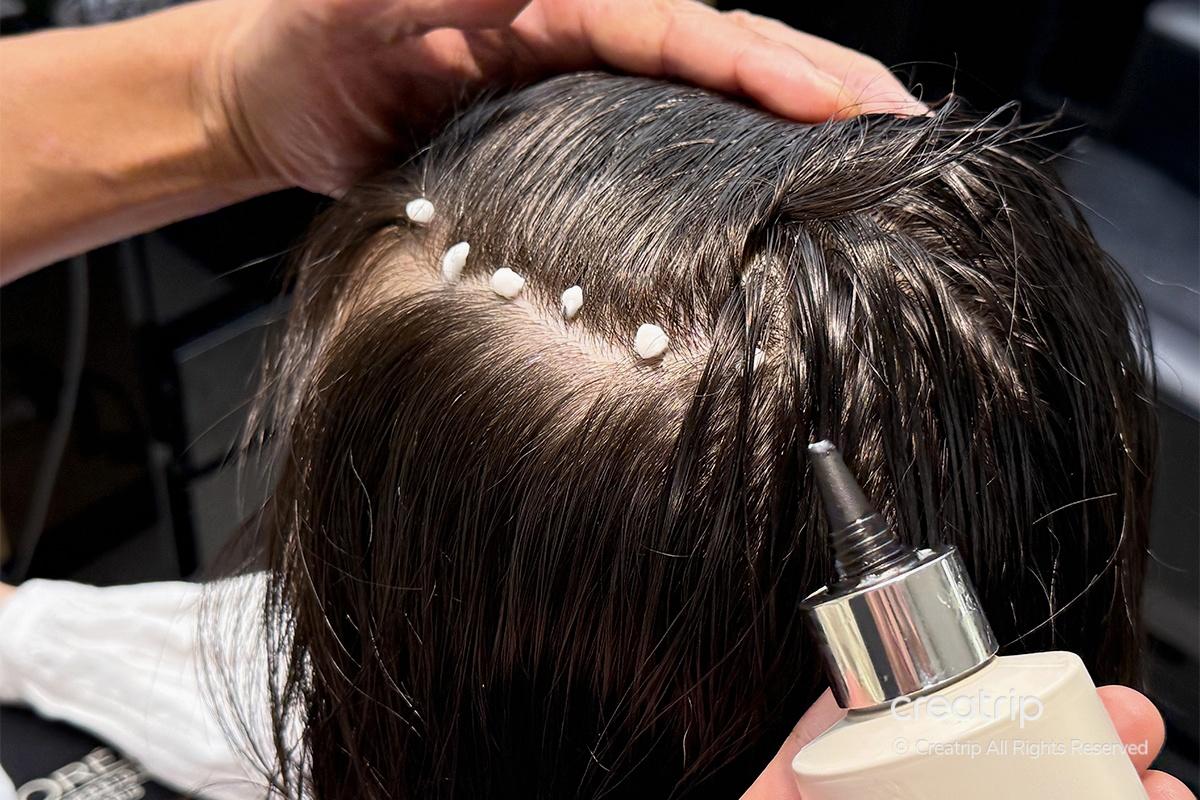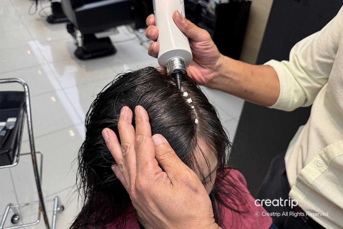 Next, a soothing mask was carefully applied all over my scalp. It helps soften dead skin cells and balance the keratin layer around the hair roots. Seeing them apply it so thoroughly to every part of my scalp really showed their thoughtfulness and professionalism.