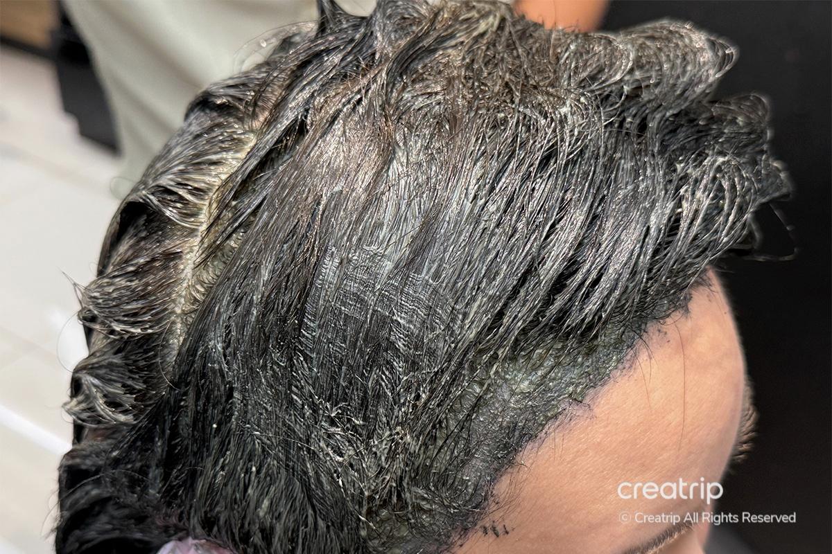 Next came the ‘medicated bath’ step. Using a soft brush, they carefully applied the medicated product to my scalp, which helps remove toxins and impurities from deep within. This step left my scalp feeling healthier and refreshed. Since the products are tailored to each person’s scalp, you can really feel the attention to detail.