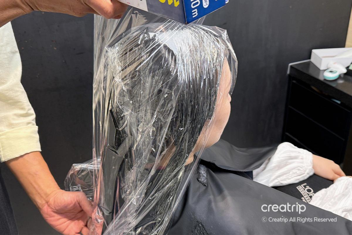 After applying all the dye, they wrapped my hair in plastic and let it sit for a while. About 10 minutes later, the stylist carefully checked the coloring process.