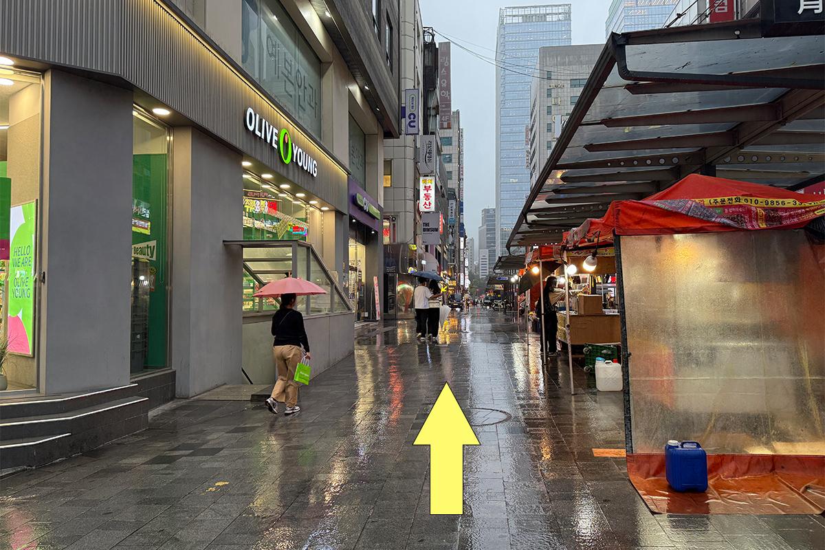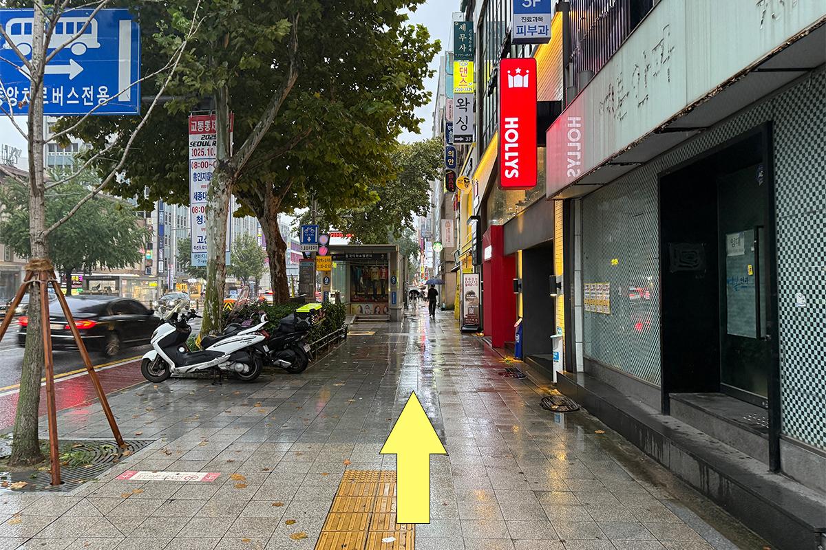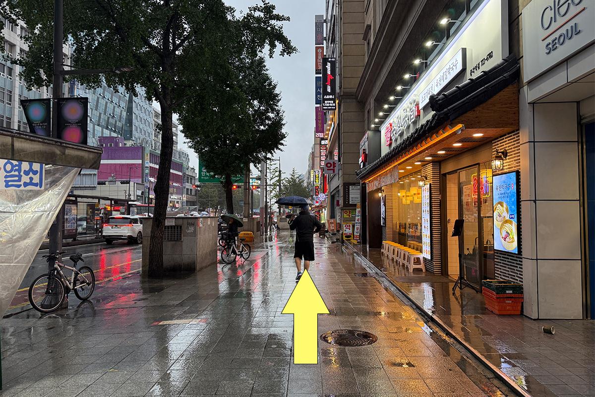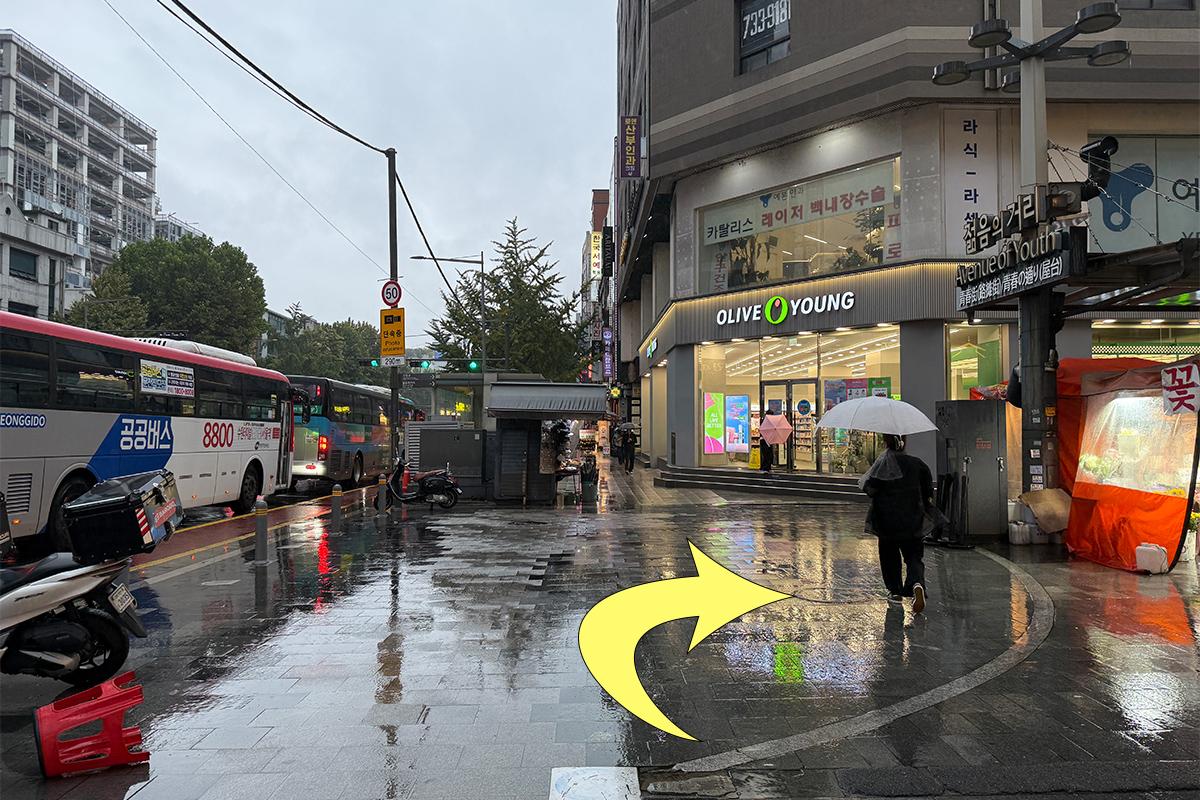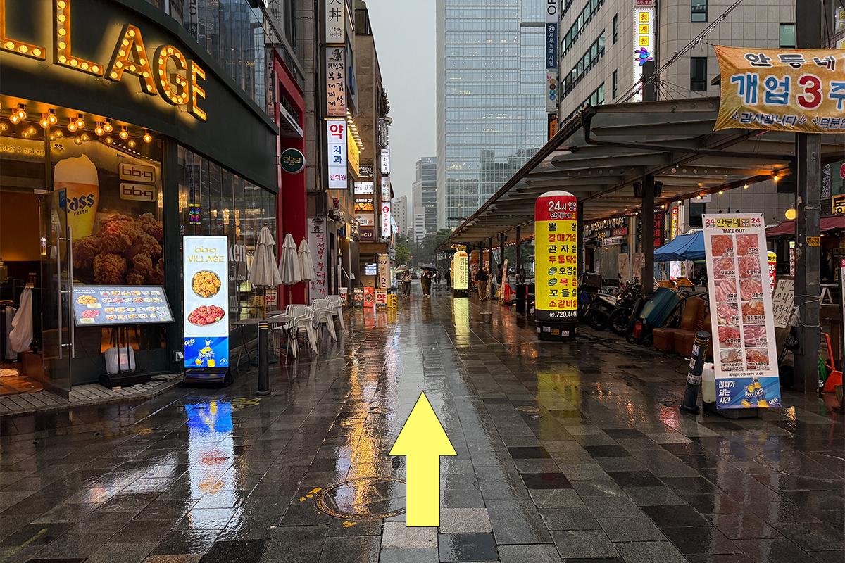 Continue straight until you see the sign for 'Boneline Korean Medical Clinic' above the 'CU' convenience store.