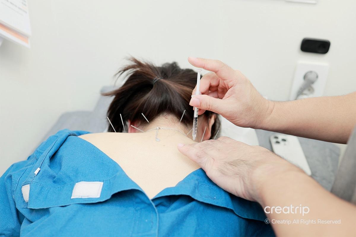A medicinal extract derived from herbal medicine is injected directly into the painful area with a very small syringe to enhance the effect,