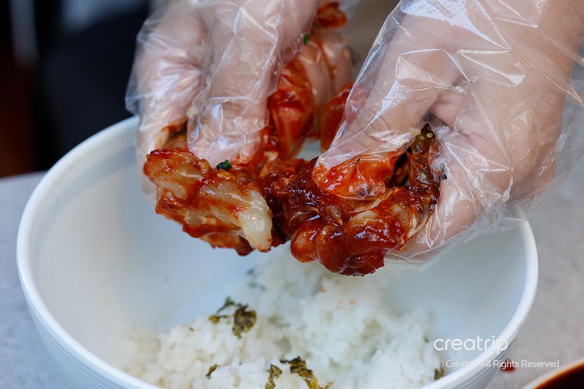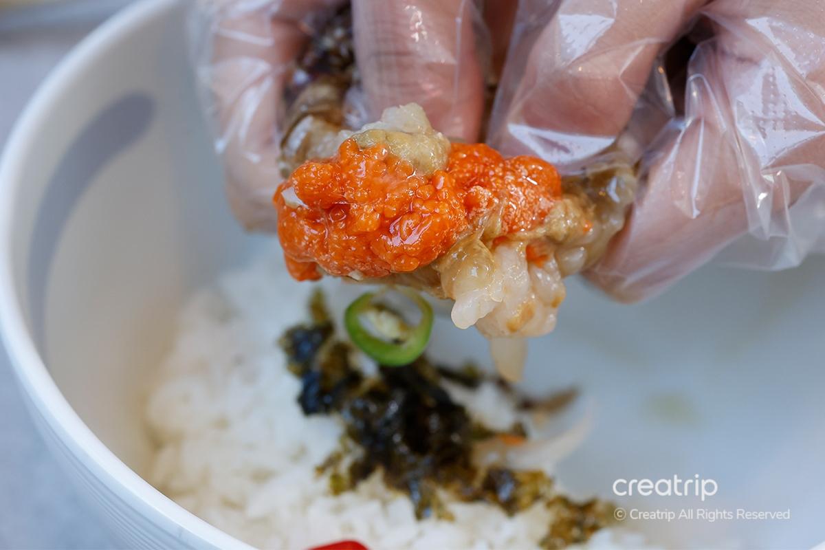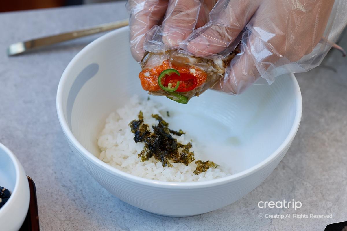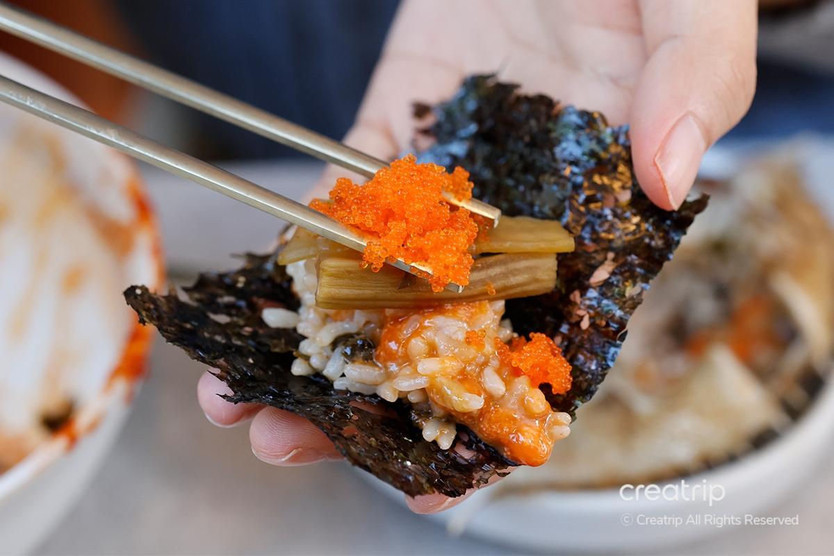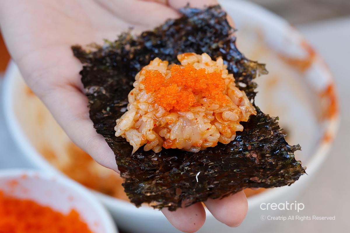 Squeeze the meat from the Buldak Gejang (spicy marinated crab), mix it with rice, place it on a sheet of seaweed, top it with flying fish roe, and eat it all in one bite—it's absolutely amazing.
