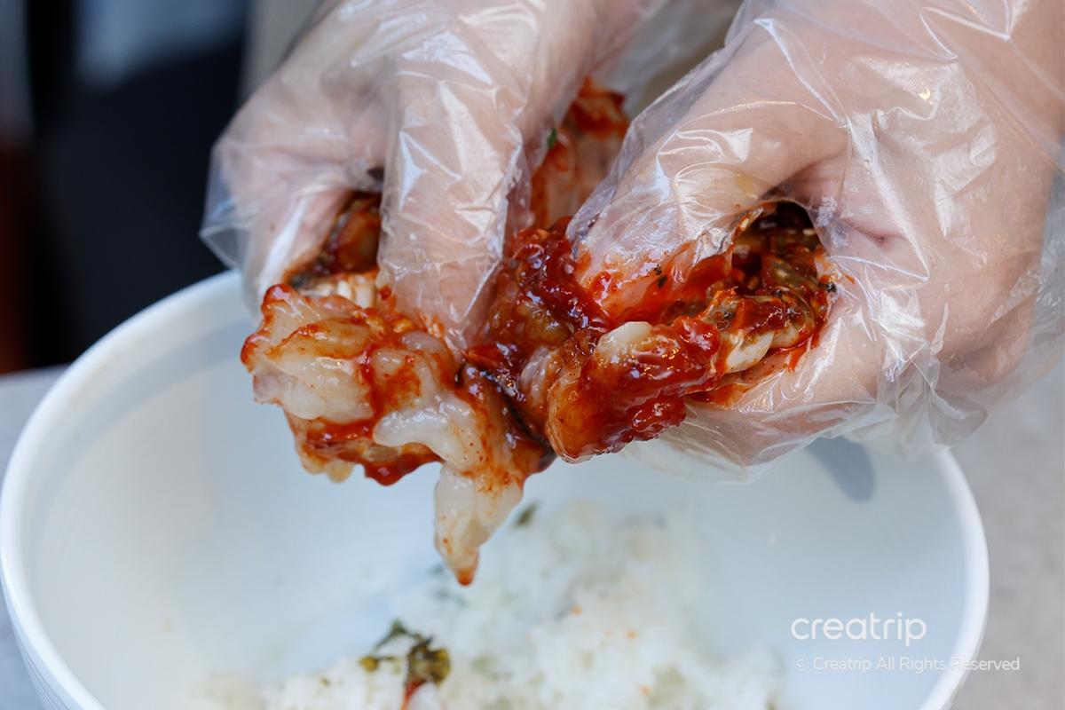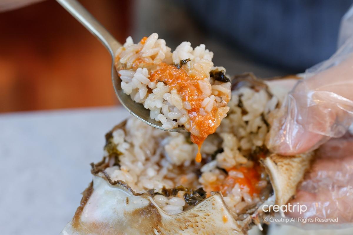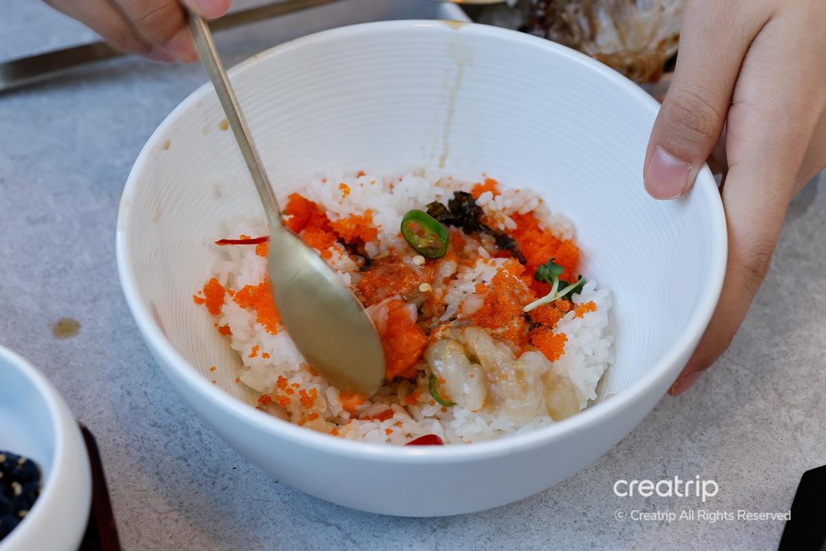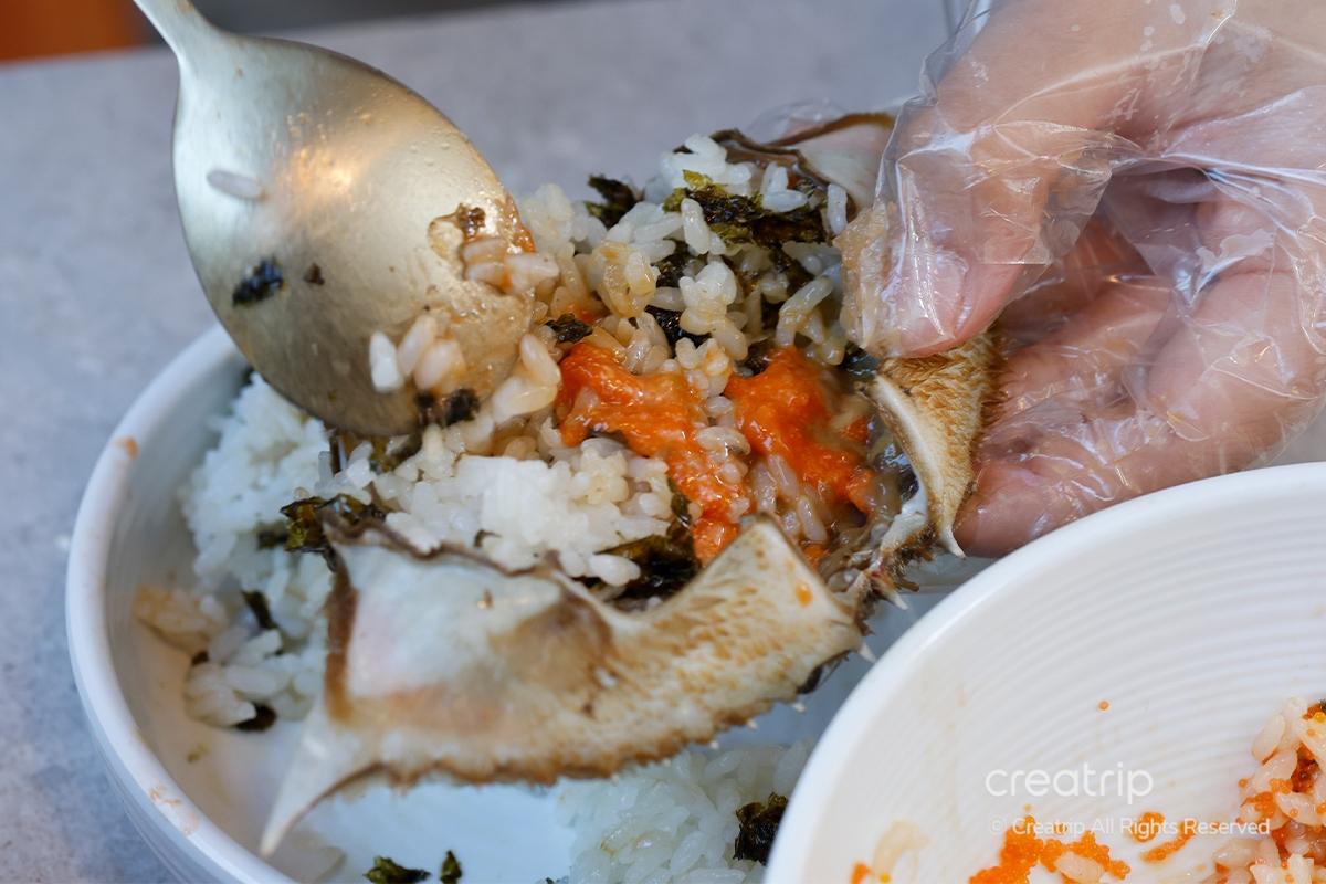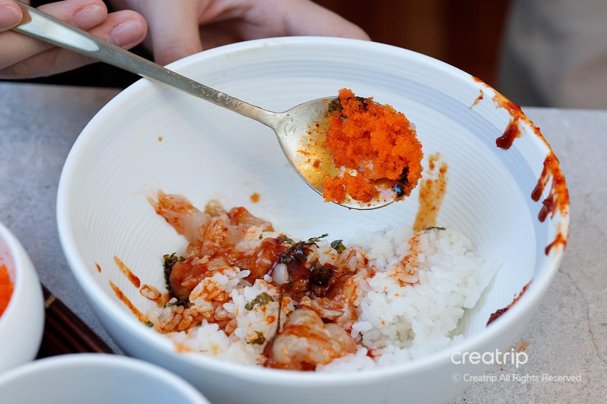 Squeeze the meat from the Buldak Gejang (spicy marinated crab), mix it with rice, place it on a sheet of seaweed, top it with flying fish roe, and eat it all in one bite—it's absolutely amazing.
