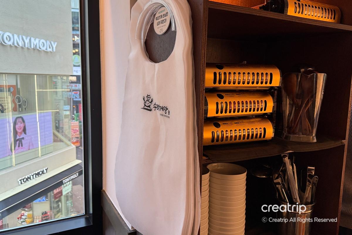The essential scissors, tongs, and aprons for enjoying marinated crab were available in the middle of the restaurant!