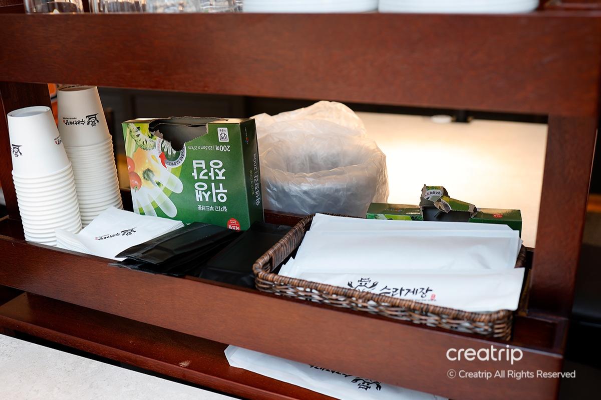 Next to the table, individually wrapped spoons and chopsticks, wet wipes, tissues, and plastic gloves were neatly organized.