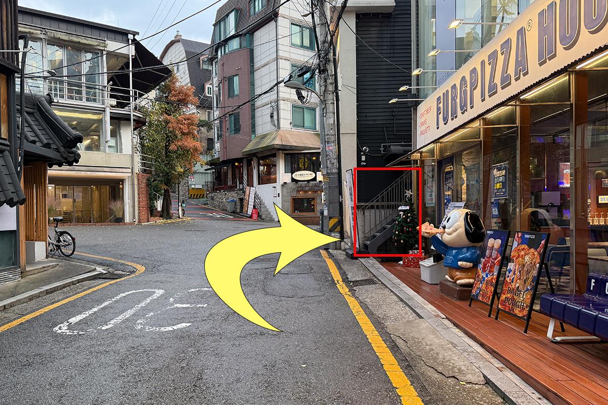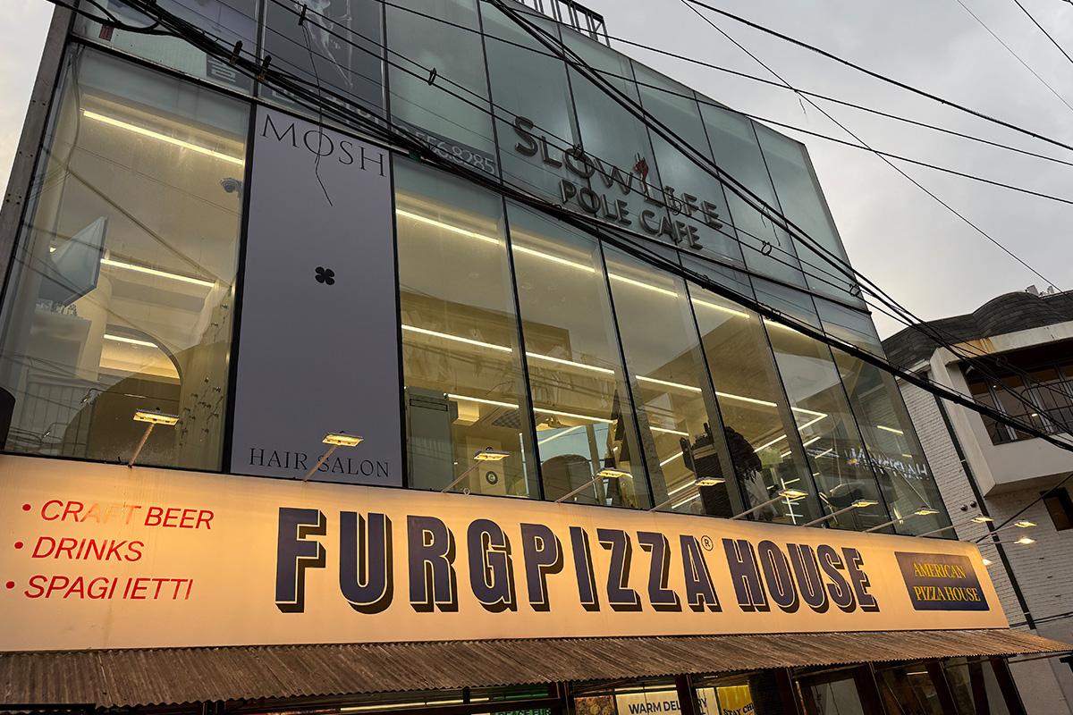 Go up the stairs next to 'FURGPIZZA HOUSE'.