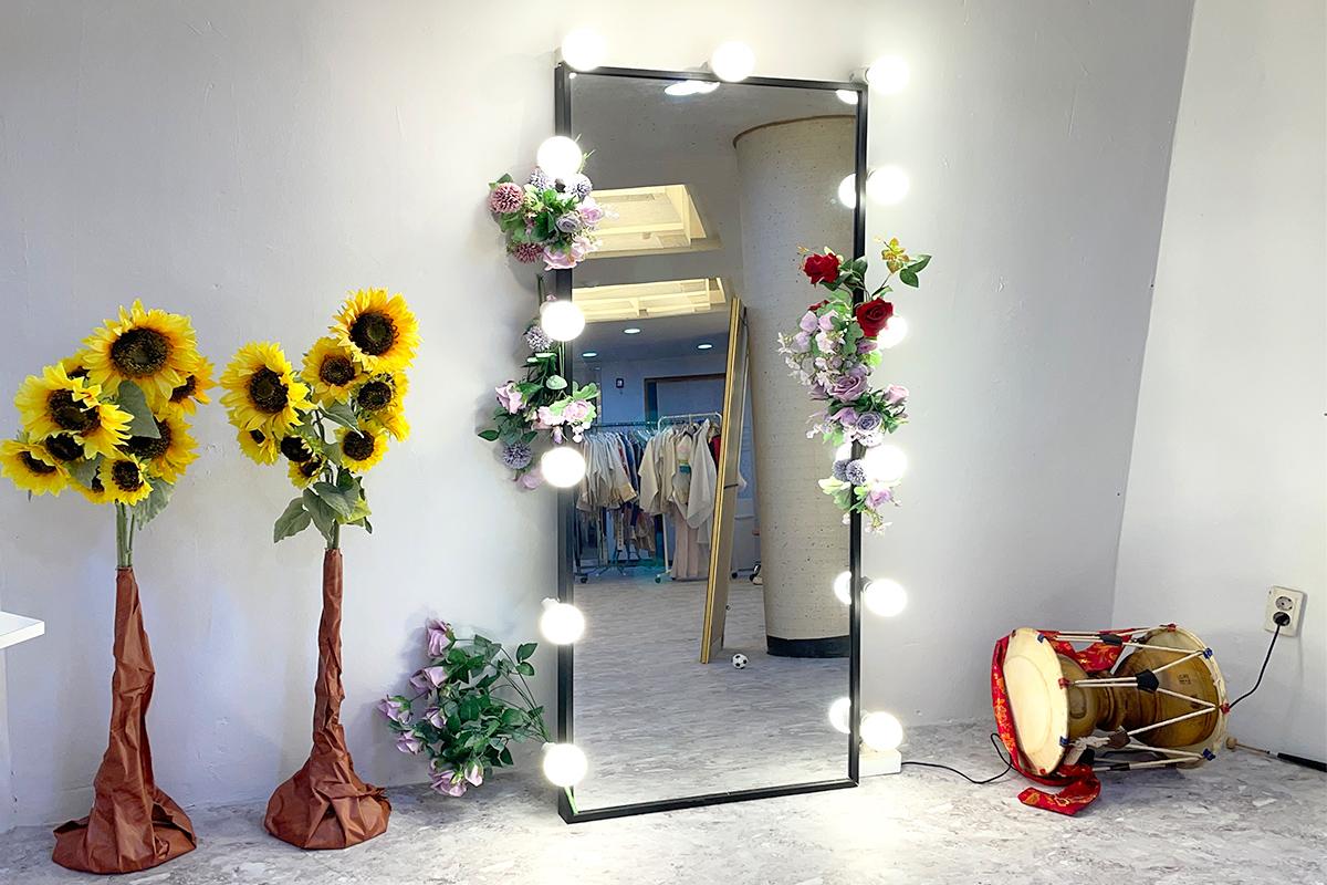 There is a large mirror next to the makeup area, which is Haewadal's photo spot. The lighting here is perfect for photos, so many people will take photos here after putting on a Hanbok and getting their hair styled.
