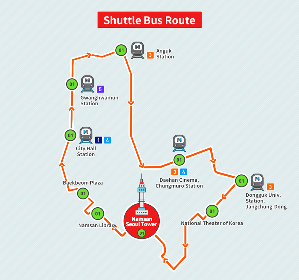 1. Take a shuttle bus: Take the shuttle bus for the N Seoul Tower. The N Seoul Tower is the last stop.
