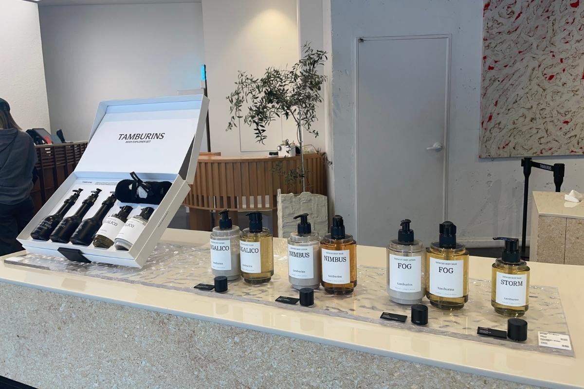 On the left side, there is a sink with a collection of scented soaps and lotions you can try out!