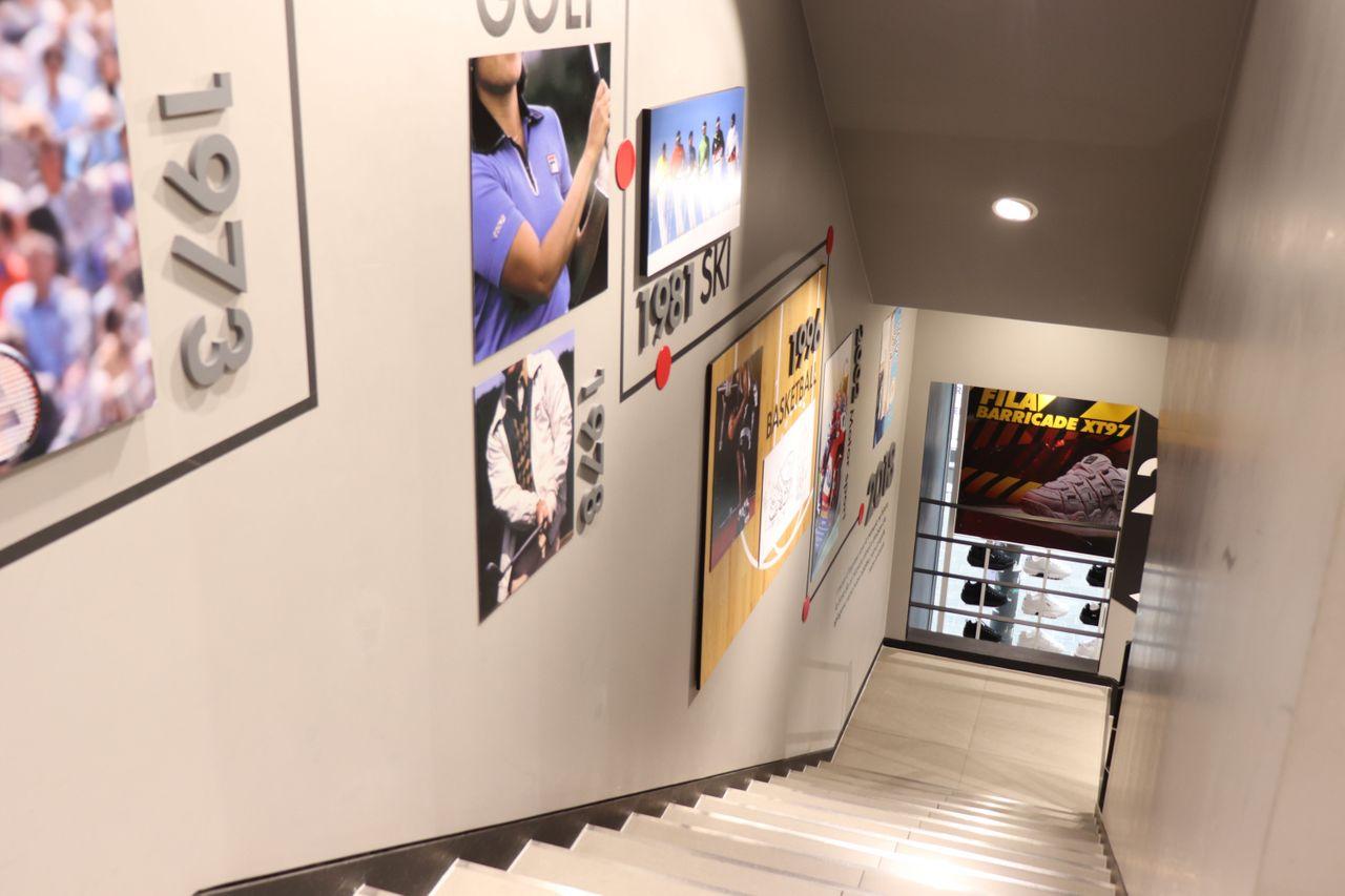 The wall on the side of the staircase displays clothing and shoes that were presented in the FILA museum at Biella giving off a vibe that can only be felt at the FILA Seoul store.