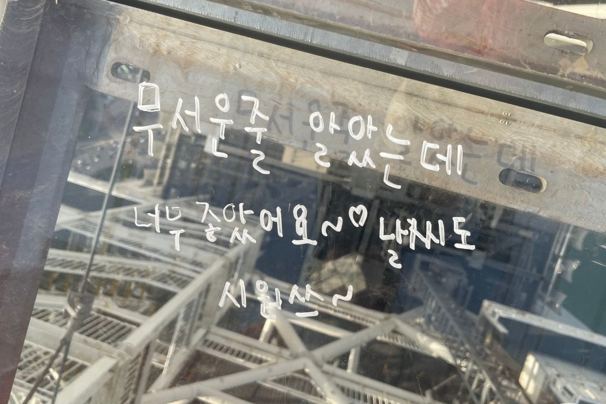 Después de tomar fotos, el personal nos dio un bolígrafo blanco y nos dijo que podíamos escribir un mensaje divertido en el puente si queríamos.