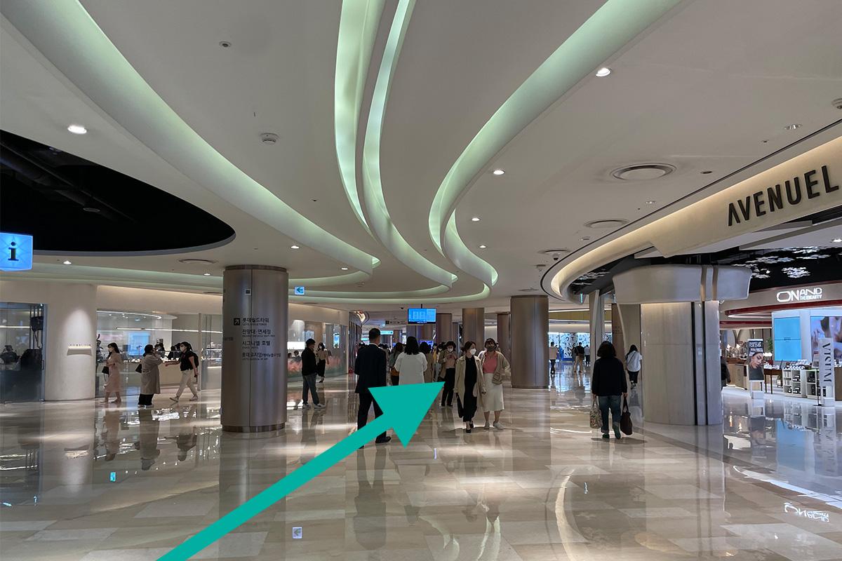 Al entrar en el edificio, camine recto. Hasta que pase la zona de cosméticos de Avenuel. Si tienes miedo de perderte, puedes ver el camino hacia Seoul Sky desde las columnas en el centro comercial.