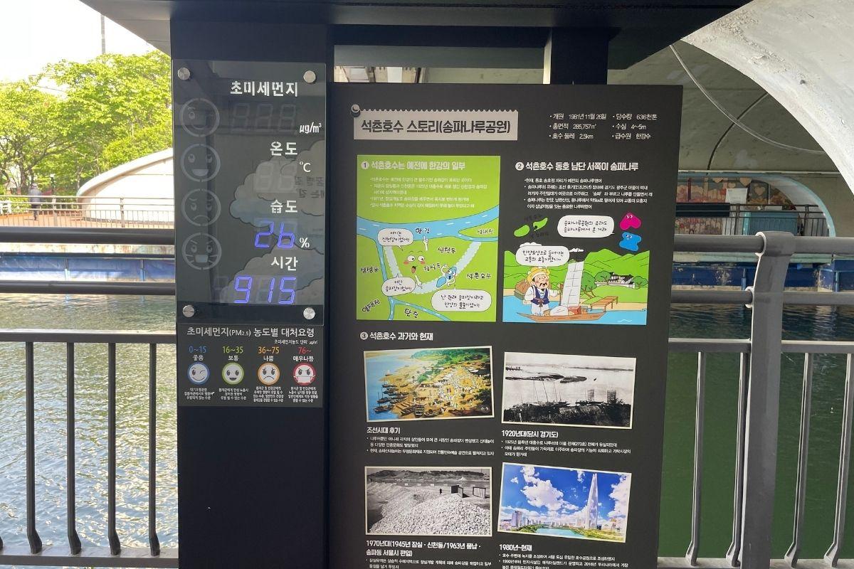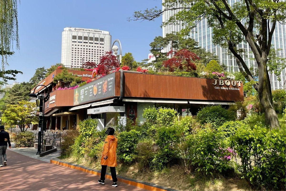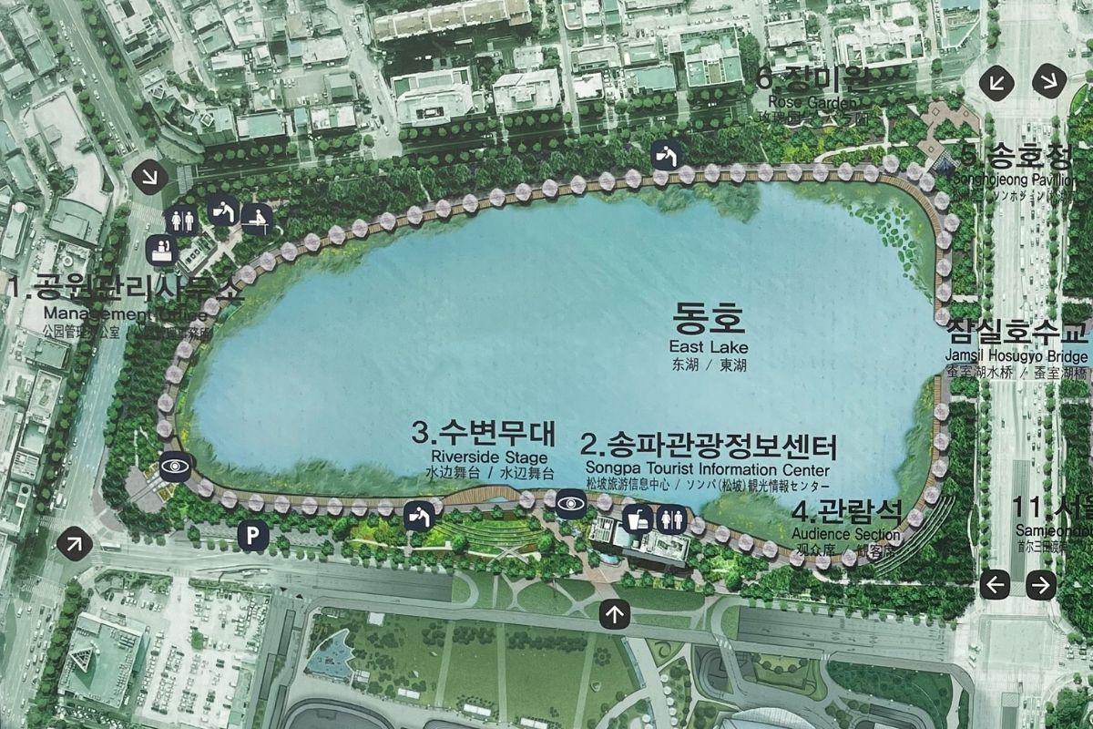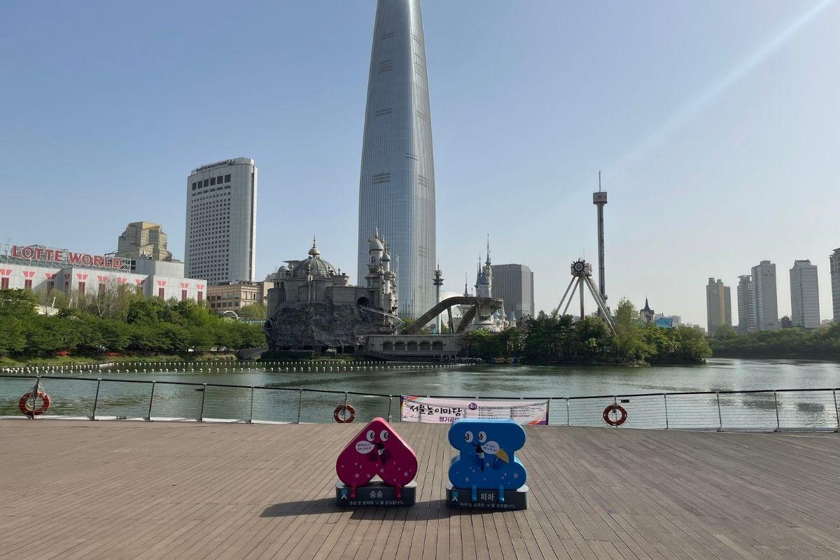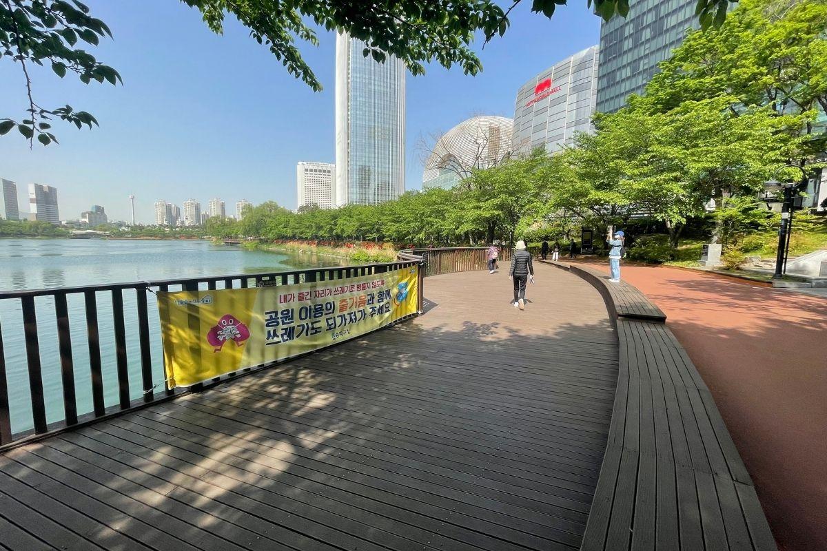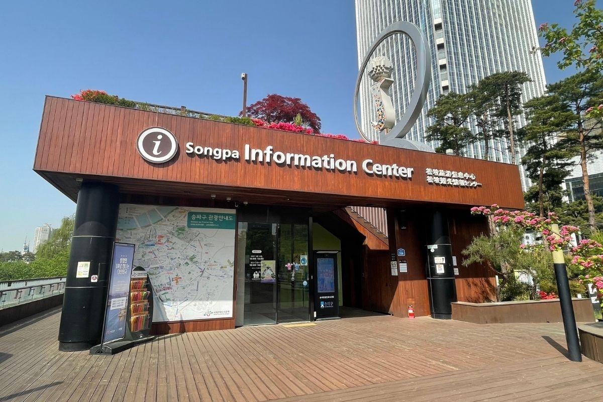 En el lado este del Parque del Lago Seokchon, verás el Centro de Información Turística, cafeterías, lugares para fotos y restaurantes. Además, esta área del parque tiene un gran jardín que también está conectado con la Lotte World Tower.