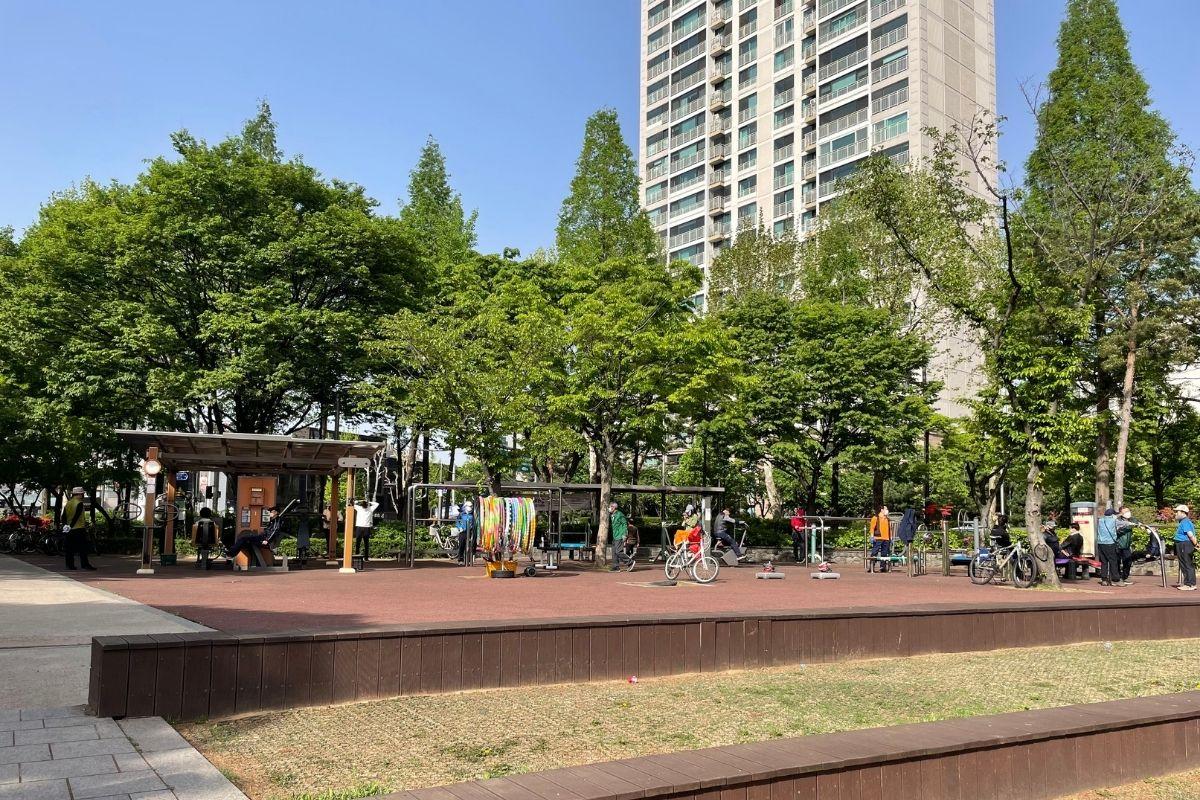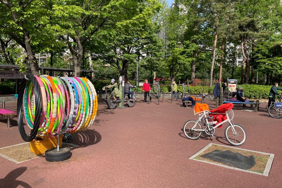 Al subir las escaleras a la derecha, llegará al parque de ejercicios que está abierto para que todos lo usen.
