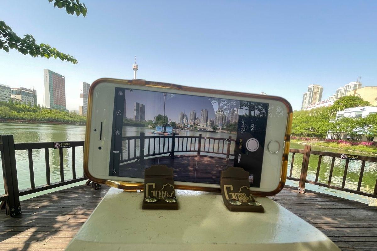 Como en la foto de arriba, puedes ver que hay muchas áreas lindas y convenientes donde puedes colocar tu teléfono para obtener la toma perfecta.