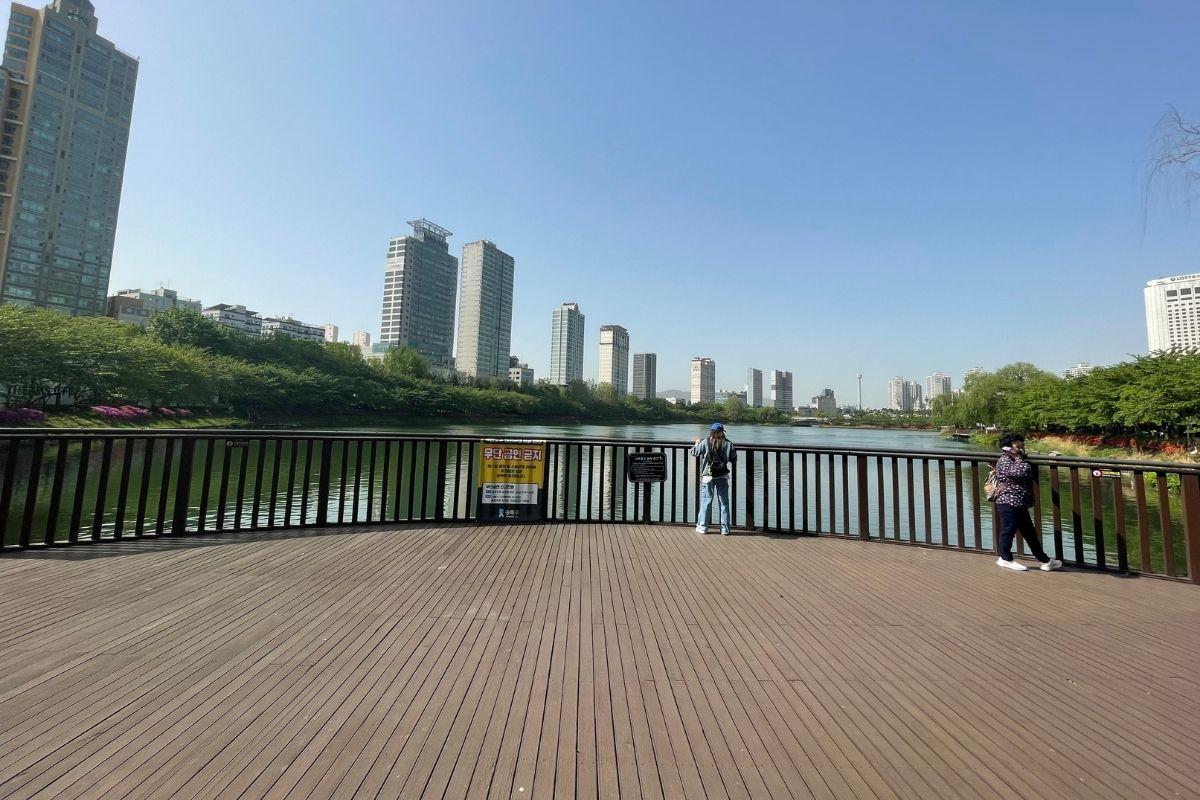 Cuando llegues al otro lado, puedes caminar por el puente para ver el espectáculo bajo el puente norte. También puedes caminar directamente hacia el lado este del Parque del Lago Seokchon.