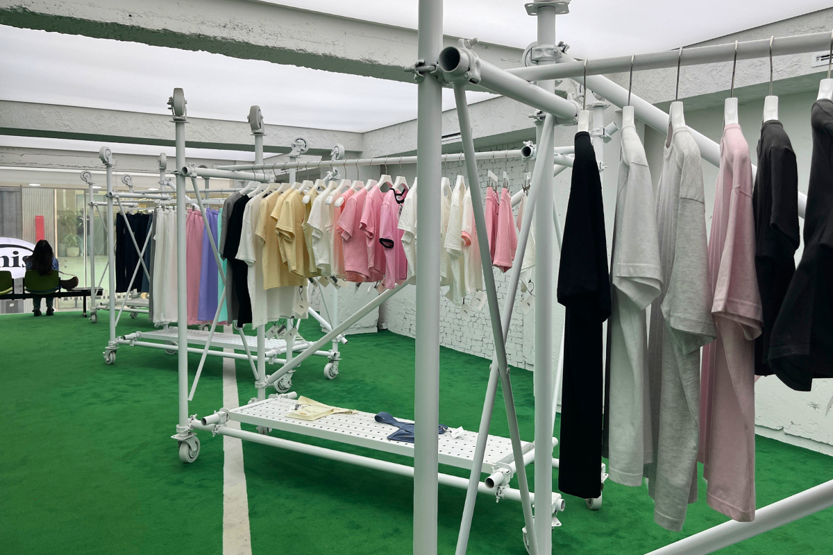 En el segundo piso, hay una variedad de ropa y artículos de moda de temporada en exhibición. ¡Incluso hay una cabina de fotos en la parte trasera!